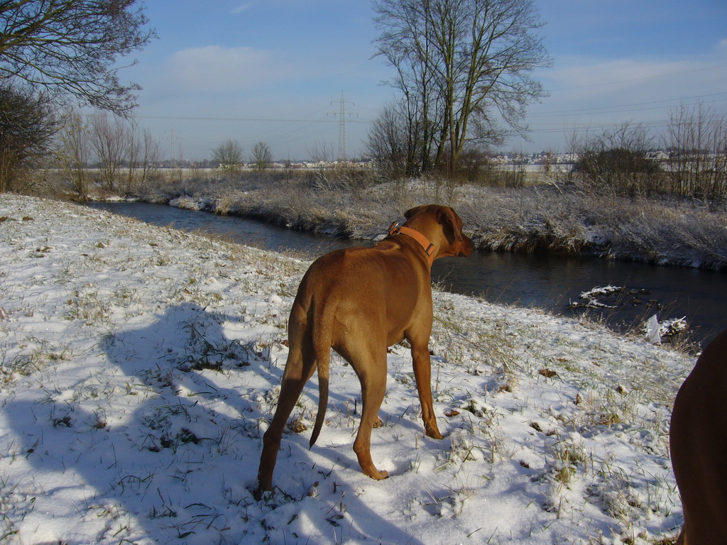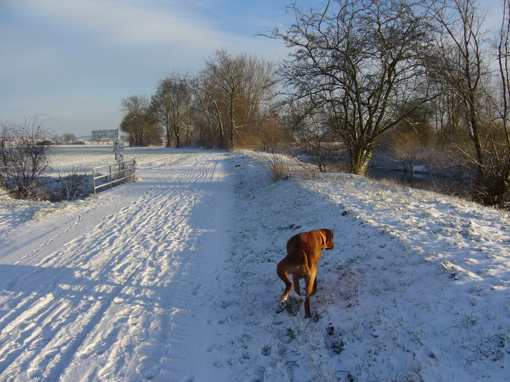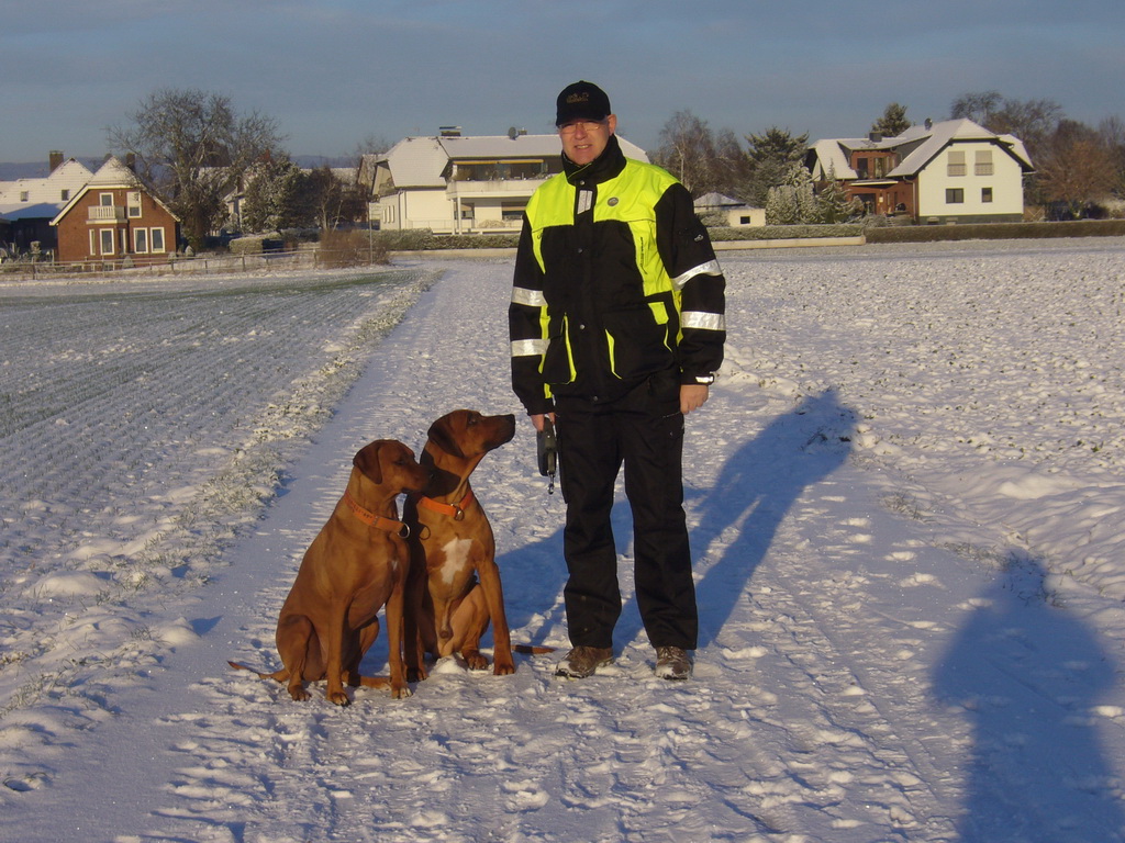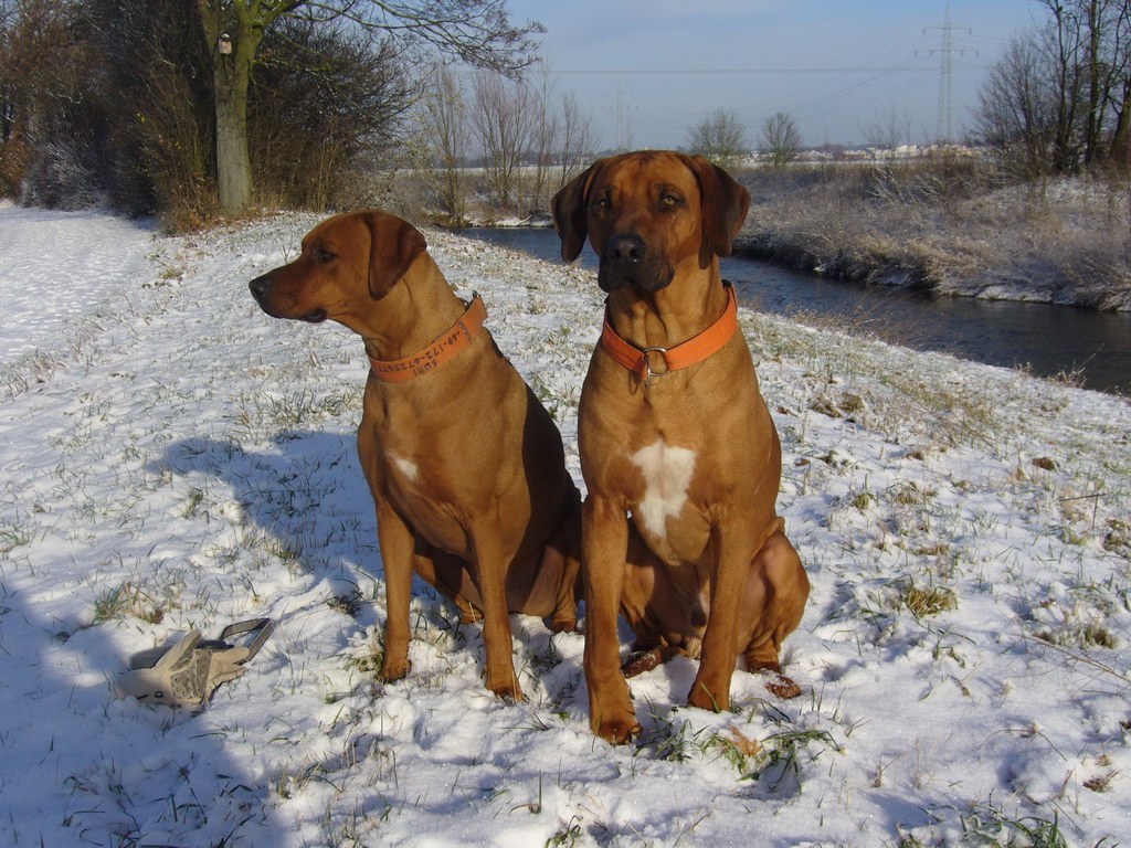 Eine Woche später trifft sich die RR-Truppe im Nidda-Volkspark in Frankfurt. Es ist feucht, und schon zu Beginn der Trainingsstunde ist es fast dunkel. Margit und ich nutzen die kurze Wartezeit auf Miriam dafür, dass sich unsere Hunde kennenlernen können. Sie beschnüffeln sich, etwas Rüden-Gebaren, ein paar Knurrer – dann ist die Sache gelaufen, und vier rotweizenfarbene Ridgebacks tollen über die Wiese.