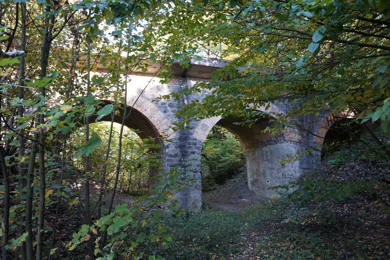 Auf einmal begegnen uns wieder mehr Menschen. Wir sind also in der Nähe von Niedererbach. Und richtig. Kurze Zeit später erreichen wir ein Eisenbahnviadukt und damit die Ortsgrenze von Niedererbach.