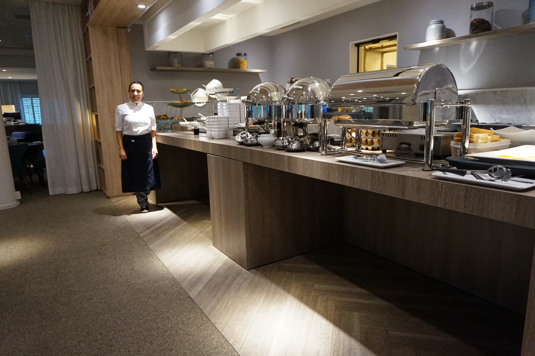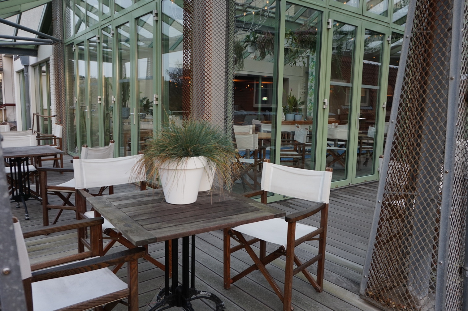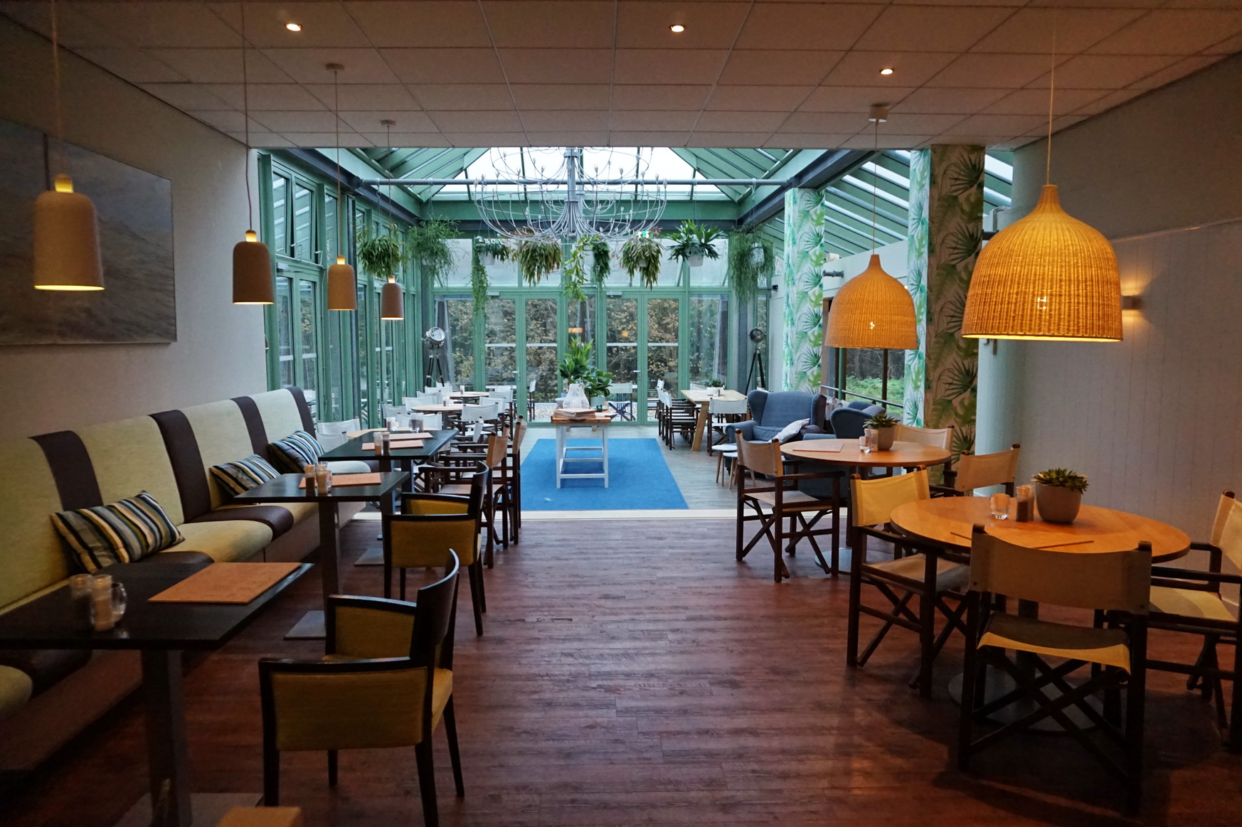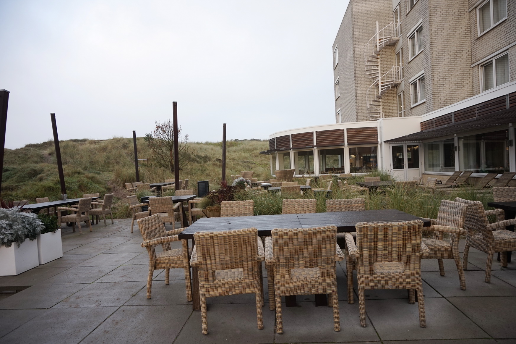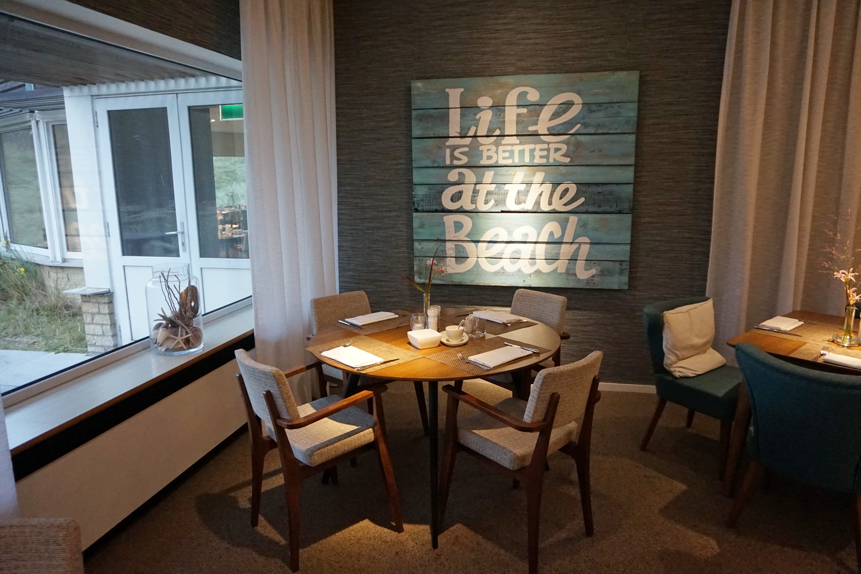 Das Hotelrestaurant ist sehr groß und weitläufig. Eine gewisse Gemütlichkeit wird jedoch durch Raumtrenner erzielt. Im Sommer kann darüber hinaus noch die Terrasse, die sozusagen mitten in den Dünen liegt, genutzt werden. Hier wird gefrühstückt, geluncht und zu Abend gegessen.