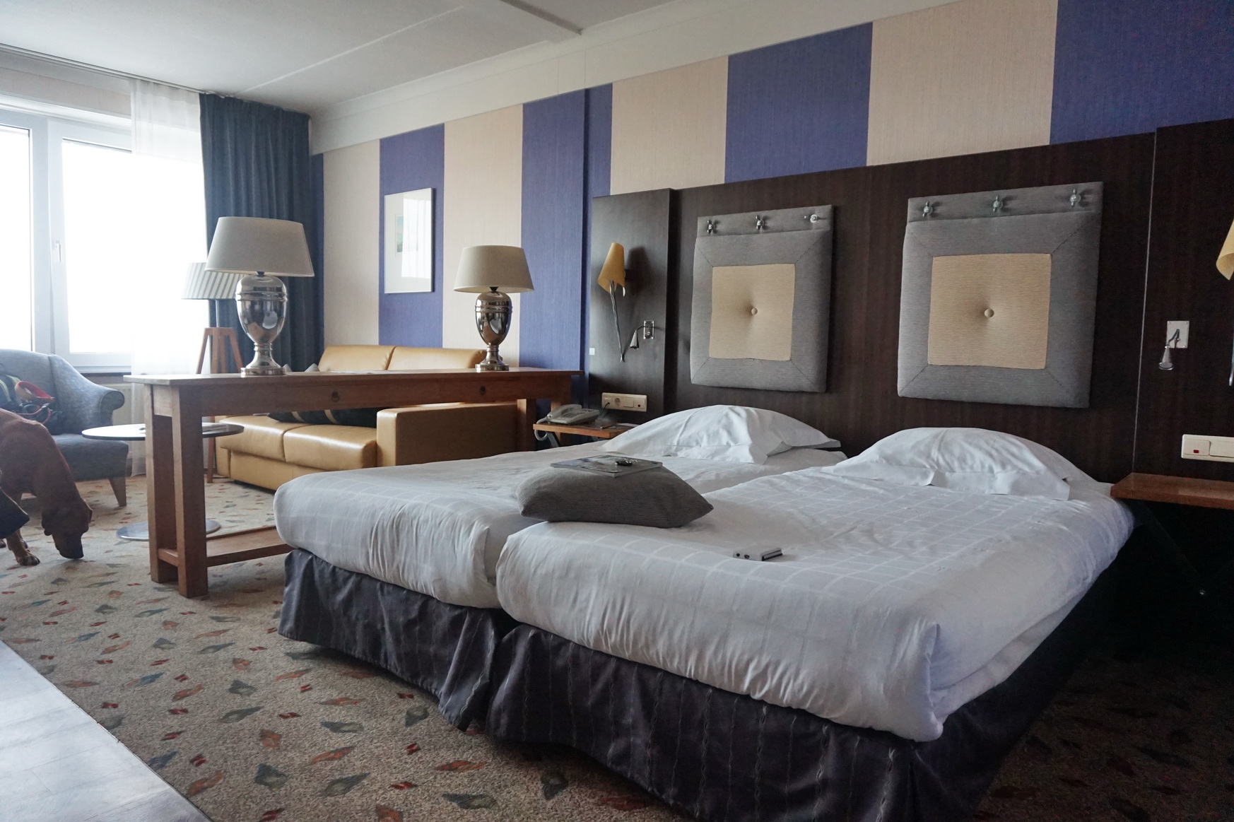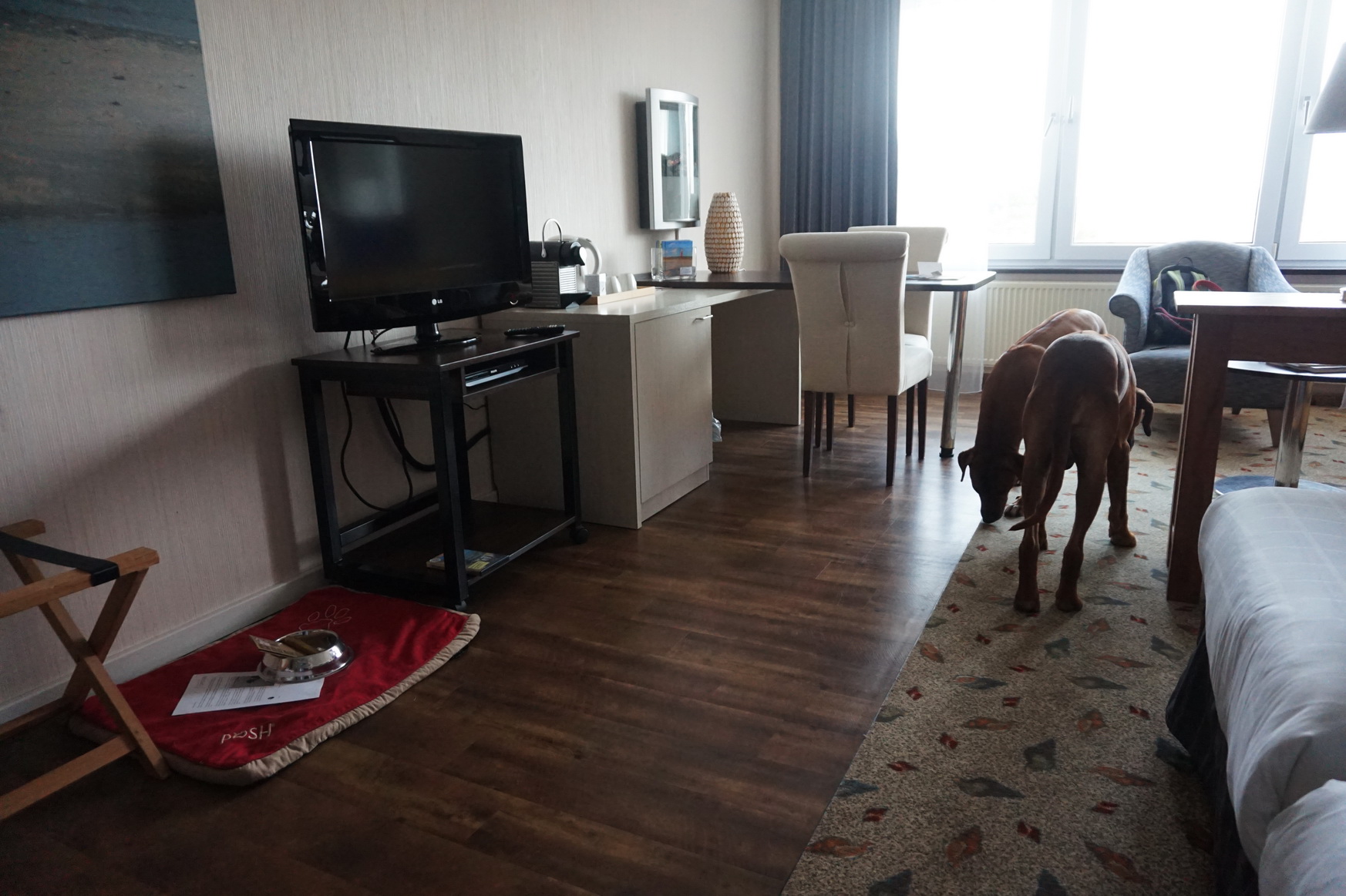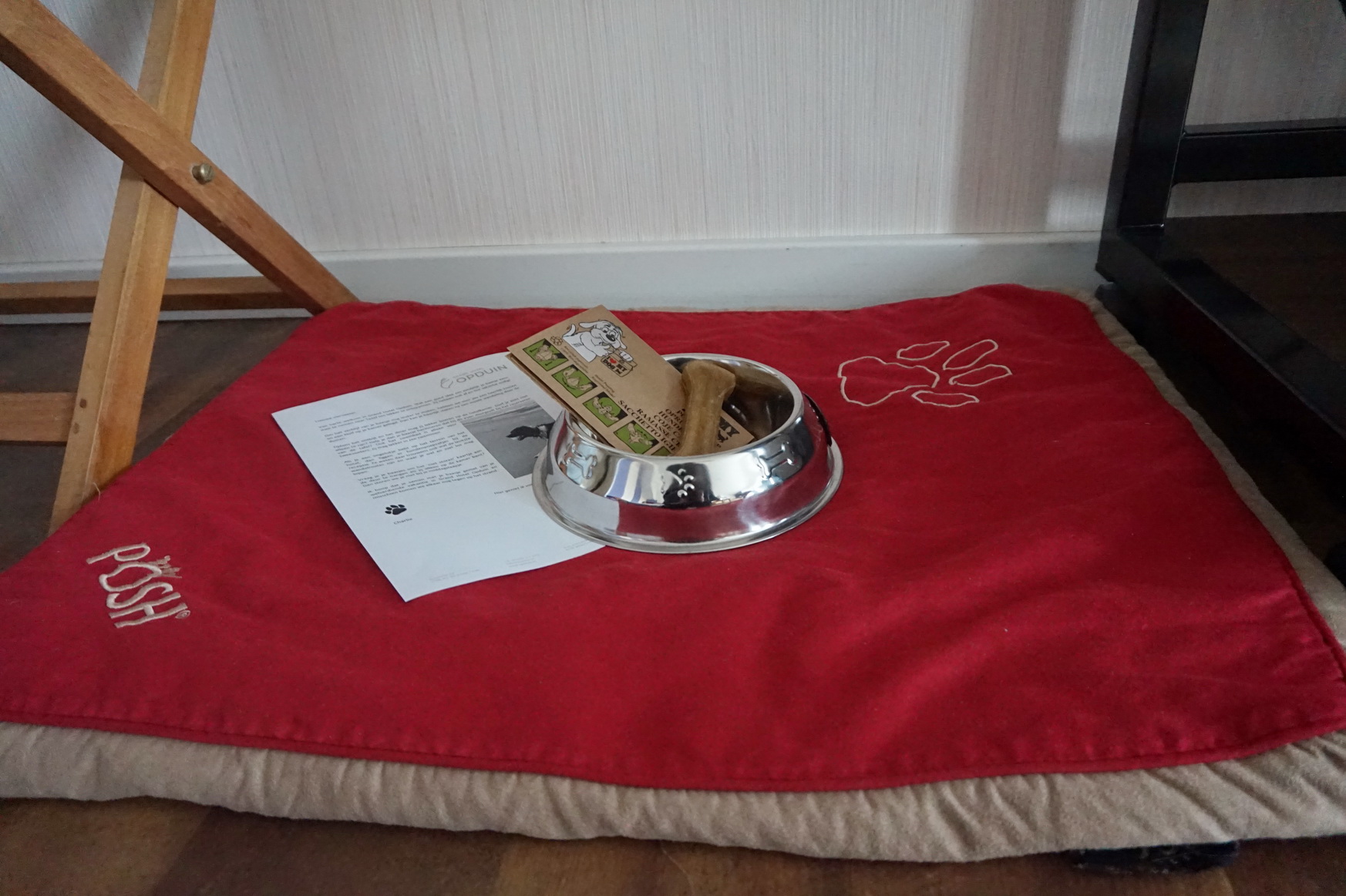 Dayo und Suri wurden separat mit Kauknochen, Wassernapf und Hundekissen begrüßt. Darüber hinaus gab es ein kleines Anschreiben. Da das Anschreiben in niederländischer Sprache verfasst war, kann ich nur vermuten, dass es sich hierbei um „Benimm-Regeln“ für die Vierbeiner im Hotel handelte.