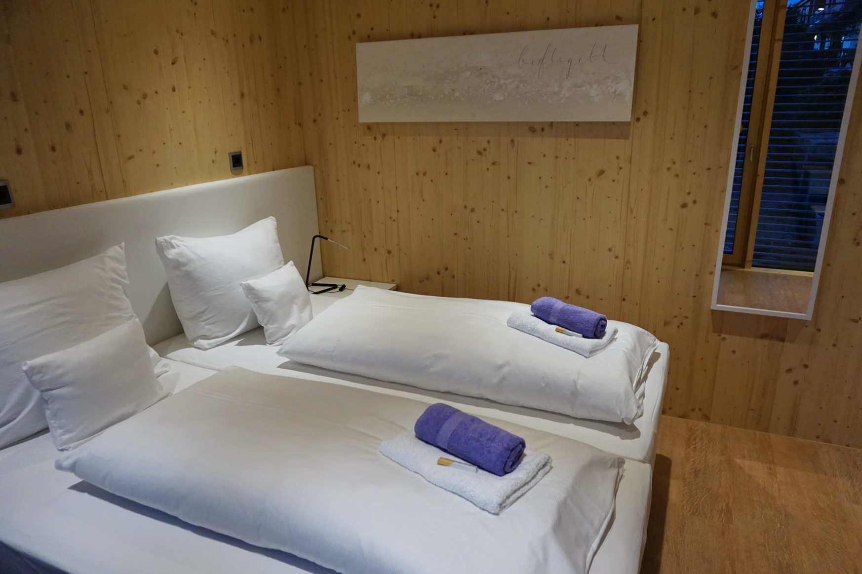 Blickfang im Zimmer sind das (äußerst bequeme) Queen-Size-Boxspringbett und ein großflächiges „Sprüche“-Bild, das sich als Elektroheizung entpuppt.