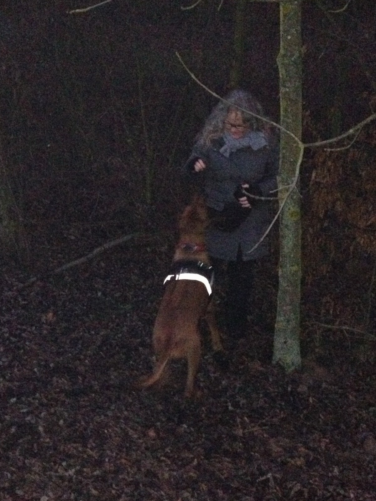Dann ist Suri dran. Die erste Suchrunde spult Madame absolut professionell ab. Wir sind alle total erstaunt: schnellen Schrittes (Frauchen muss sich auch schneller bewegen!), Nase meistens auf dem Boden, geht es ruckzuck zur Suchperson. Überschwängliches Belohnen und Freude auf allen Seiten. Petra versteckt sich ein zweites Mal – die Messlatte wird höher gelegt, denn die zu bewältigende Strecke ist länger als sonst. In der Zeit, die Petra benötigt, um sich zu verstecken, scheint auch Suri eine Veränderung zu durchlaufen. Sie nimmt eine „schnelle Nase“ an Petras Strümpfen. Sie bekommt von mir den Auftrag „Search“. Und diesmal passiert gar nichts. Nein, das ist falsch. Suri stürzt sich freudestrahlend auf Margit und springt begeistert an ihr hoch. Aber sie soll ja nach Petra Ausschau halten. Mit Hilfe von Miriam bemühe ich mich, Suri zu motivieren. Es geht immer mal für ein paar Meter in die richtige Richtung. Madam dreht allerdings immer wieder ab und fühlt sich weiterhin stark von Margit angezogen. Keiner von uns versteht, warum! Dann geht der Ridgeback-Blick mal wieder in die Runde. Aber es ist mittlerweile schon fast dunkel. Suri sieht nichts. Suri soll schnüffeln. Suri schnüffelt, aber wohl nicht die Spur … sie findet Margit immer noch interessanter als alles andere. Irgendwann sind wir endlich so nah an Petra dran, dass auch meine Suri endlich begreift, dass sie Petra finden soll. Sie rennt hin, um sich die Belohnung abzuholen. Aber leider hat Petra gar nichts für meine Dickmaus! Und dann fällt es uns allen wie Schuppen von den Augen: Nicht Petra hat die Belohnungsleckerlis, sondern Margit. Und Suri war offenbar die ganze Zeit der Meinung, sie solle nach den Leckerlis suchen … ;-))