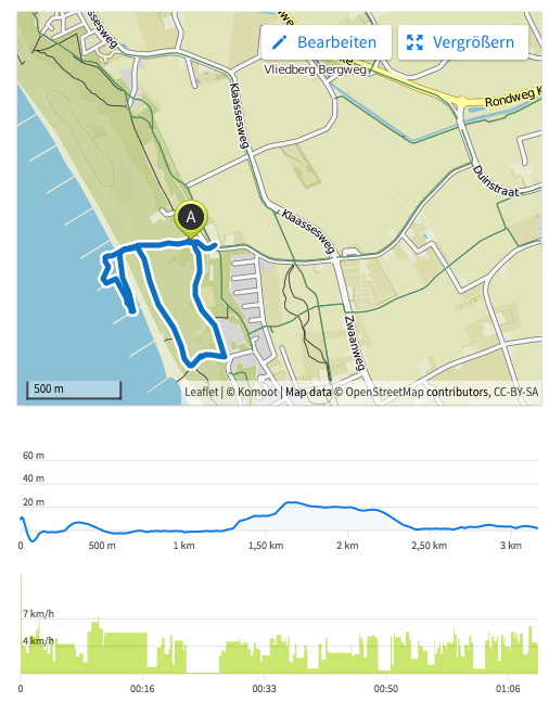 Wie ihr auf dem obigen Screenshot sehen könnt, habe ich Komoot bei einem Strandspaziergang in Dishoek (Zeeland/Niederlande) einfach mal angestellt. Wir sind ein Stück auf einem Stranddünenwanderweg gelaufen.