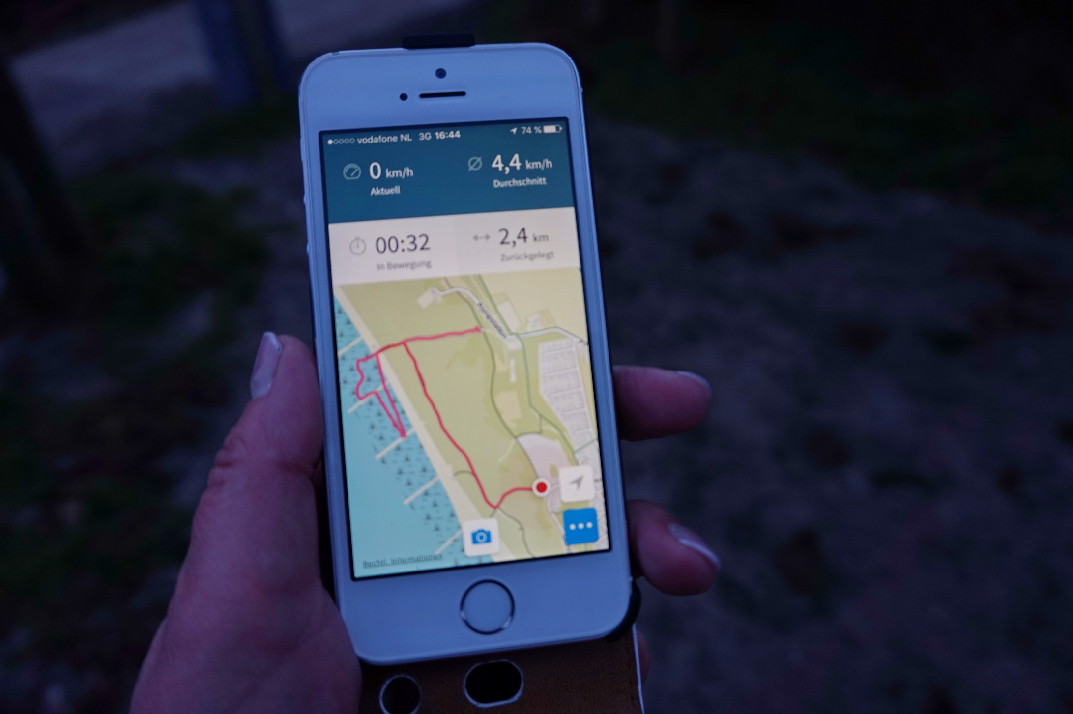 Und was soll ich sagen? Das funktioniert. Anfangs habe ich es auf meinen vertrauten Spazierrunden zu Hause ausprobiert, wo ich auf jeden Fall keinen Empfang habe. Wunderbar. Die App zeigt außerdem an, wie lange ich schon unterwegs bin und wie viele Kilometer ich bereits zurück gelegt habe.