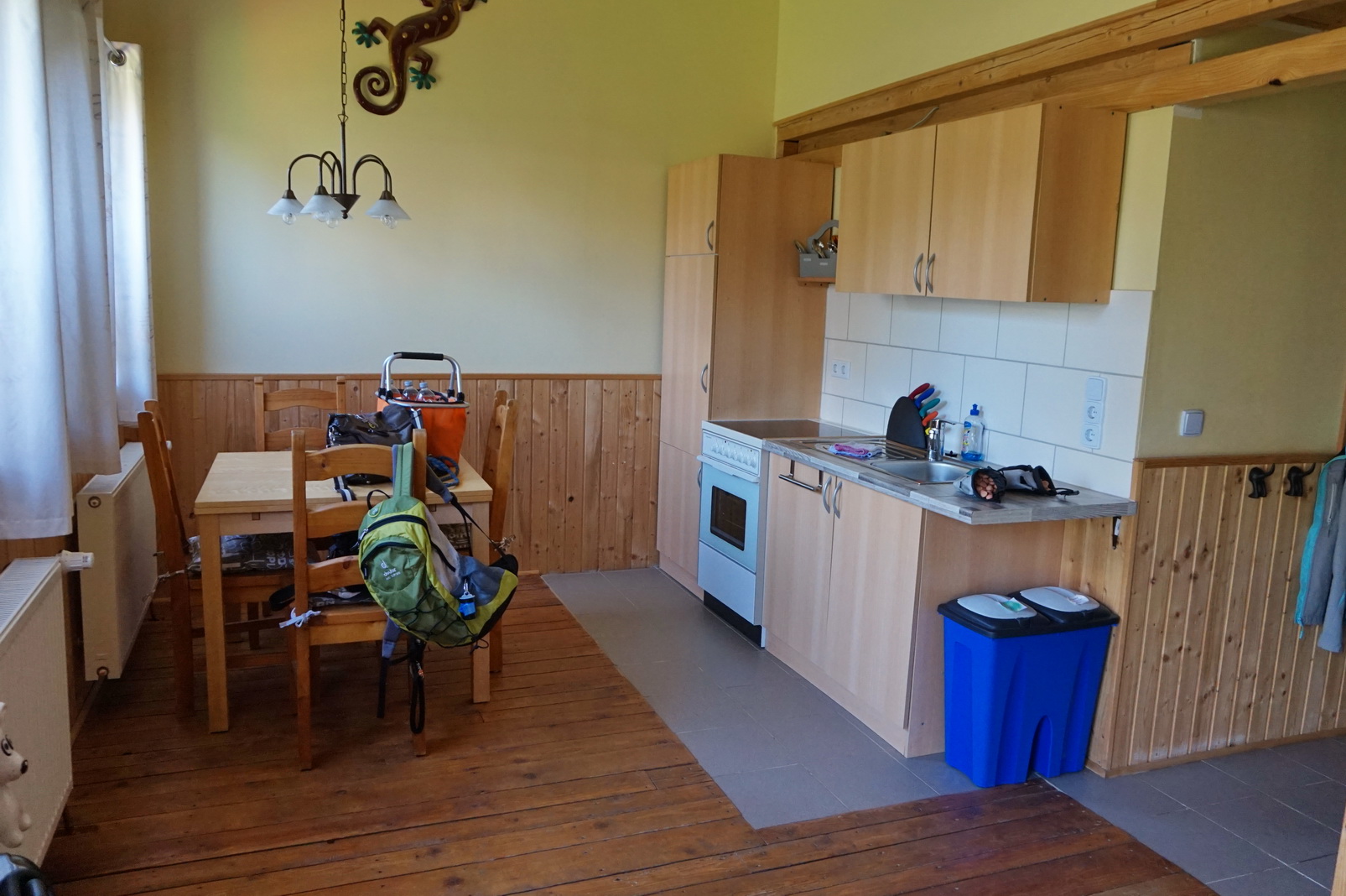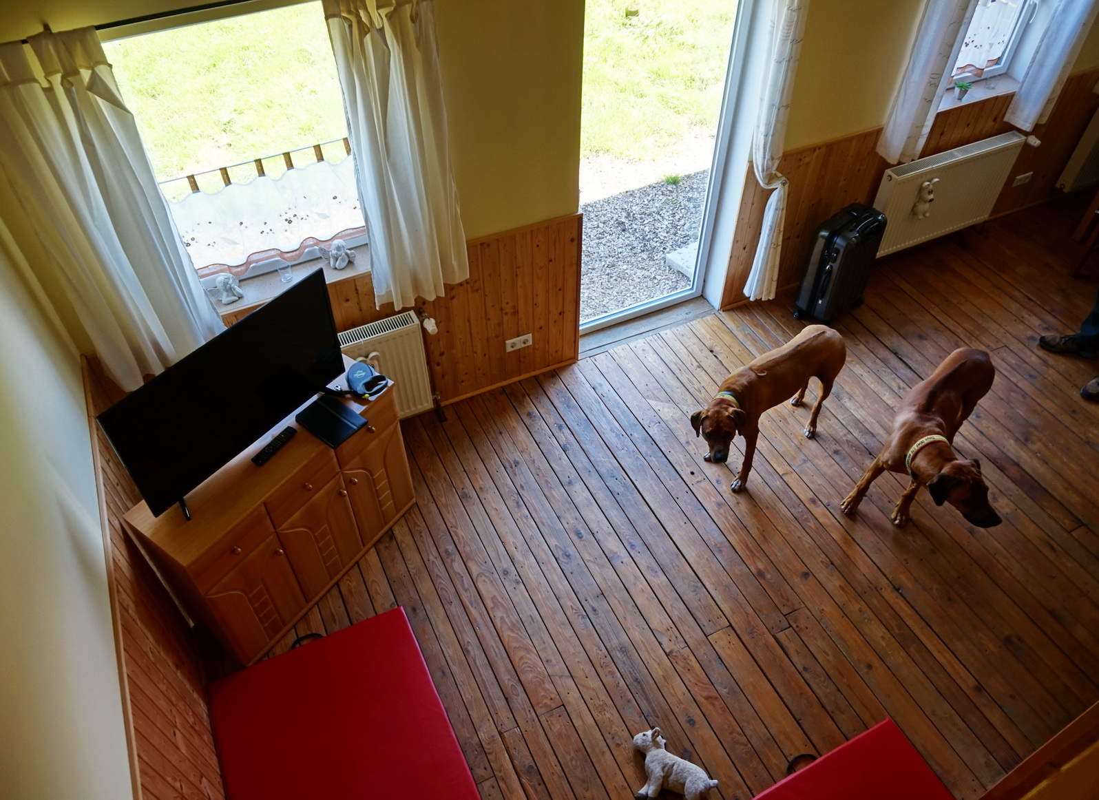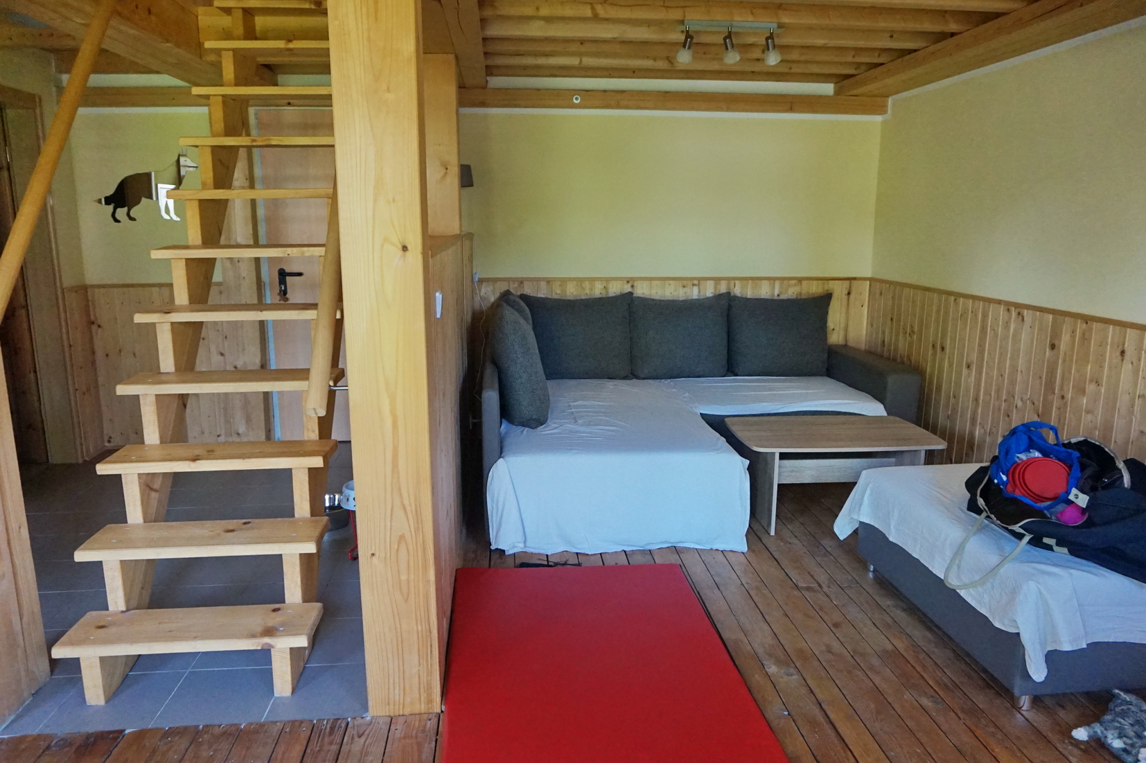 Der einzige für mich persönlich kritische Punkt ist die steile Holztreppe auf die Schlafgalerie. Dayo und Suri haben sich beide nicht getraut, nach oben zu klettern. Da die beiden es gewohnt sind, bei uns im Schlafzimmer zu schlafen, hat mir das ein bisschen leid getan. Allerdings hat sich Suri daran gar nicht gestört. Dayo ist einmal nachts aufgewacht und hat dann einen Augenblick vor der Treppe gejammert. Wir haben es alle vier überlebt … 😉 …