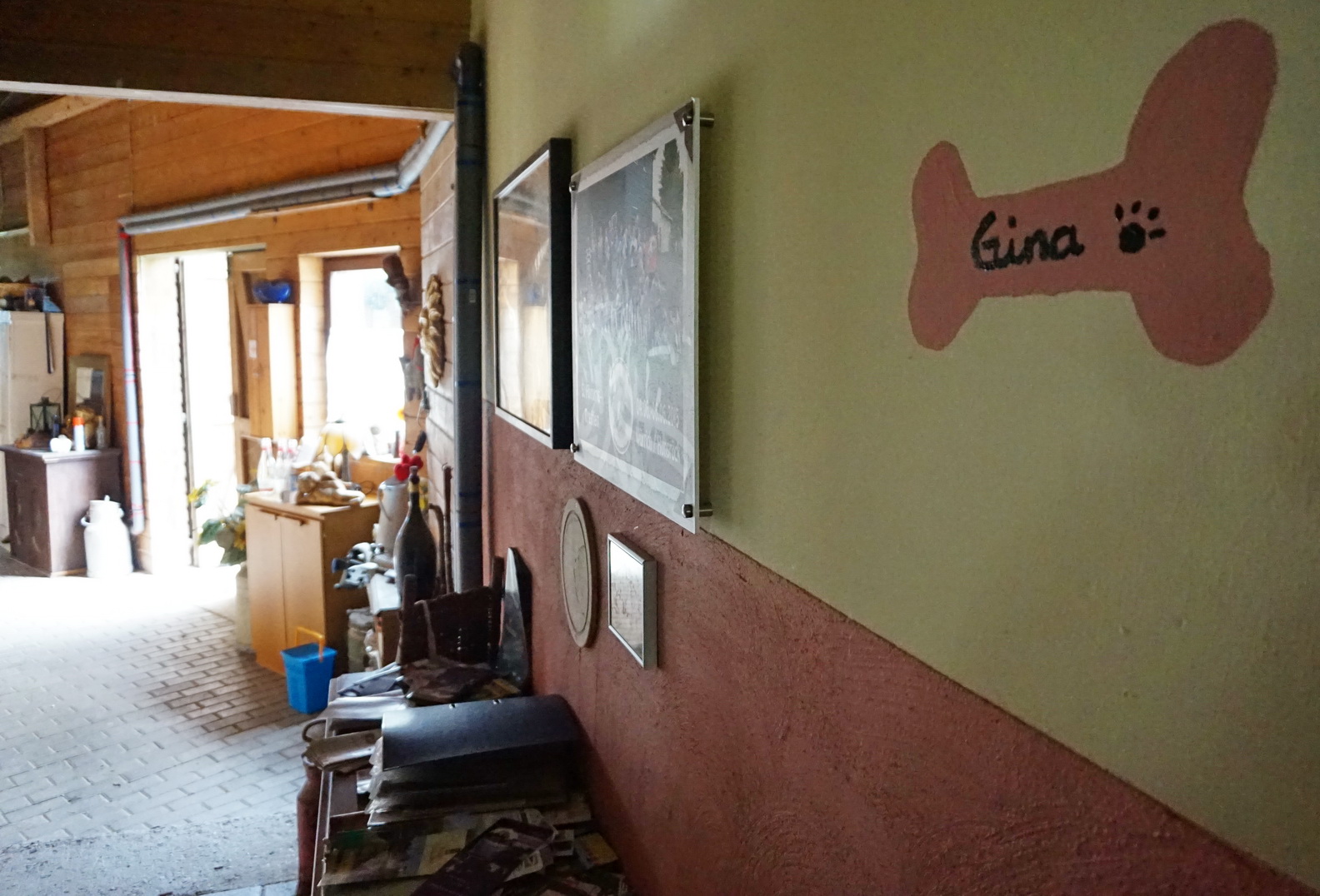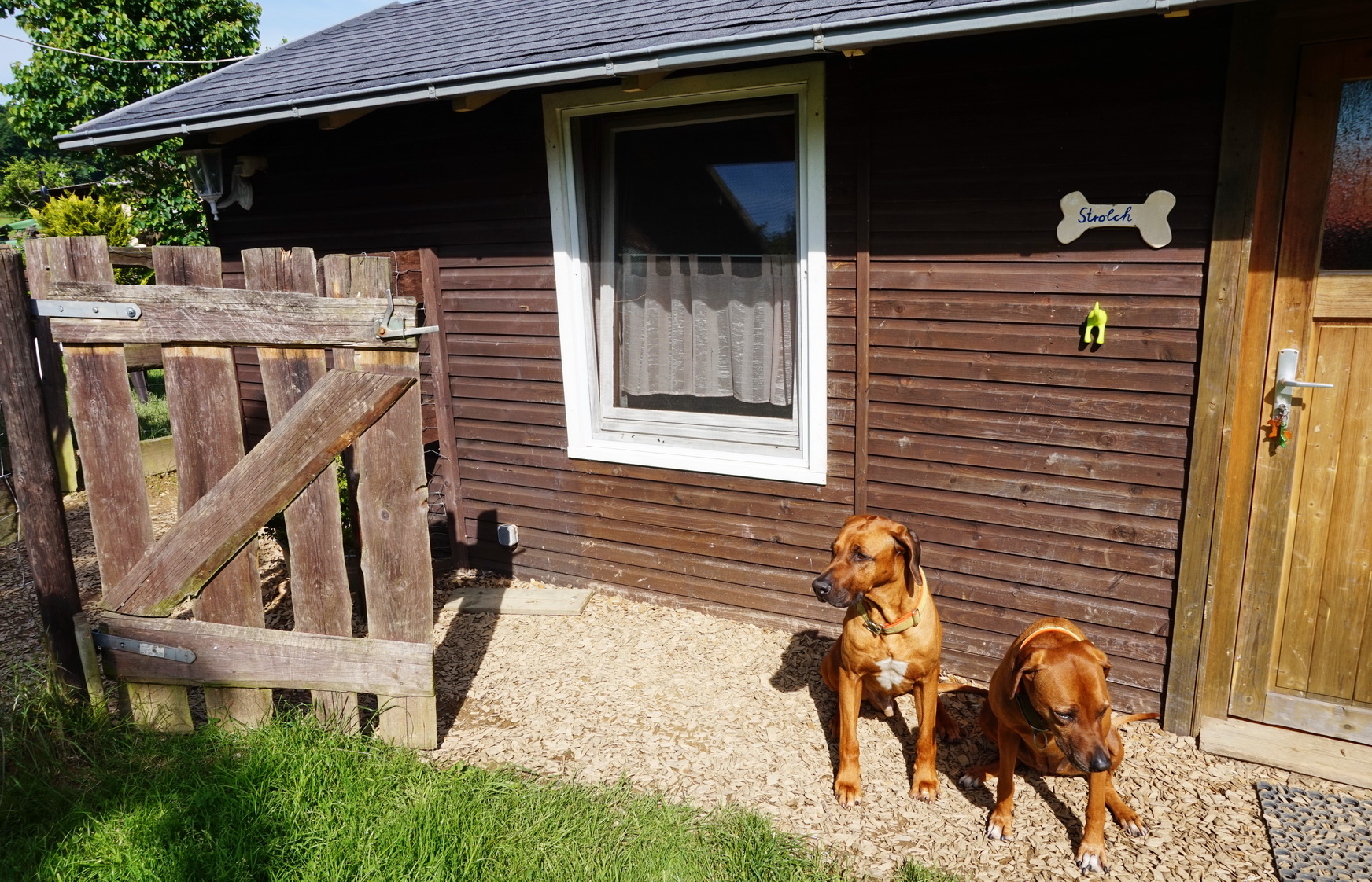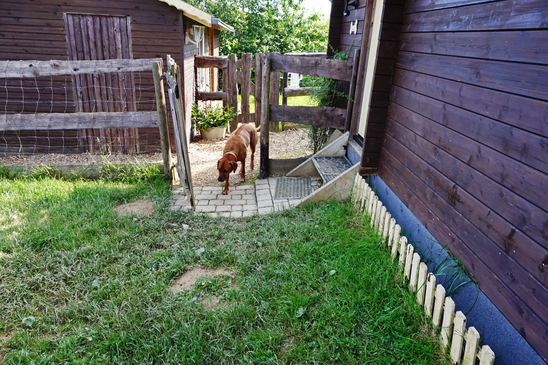 Den Außenbereich korrekt zu beschreiben, ist ein wenig schwierig. Irgendwo zwischen urig-rustikal und verträumter Bauernhof-Atmosphäre. Blumen sind eher akzentuiert gesetzt – so bleibt mehr Raum für Hundespaß, denn hier muss kein Zweibeiner darauf achten, ob der Vierbeiner gerade irgendein Blumenbeet umgräbt.
