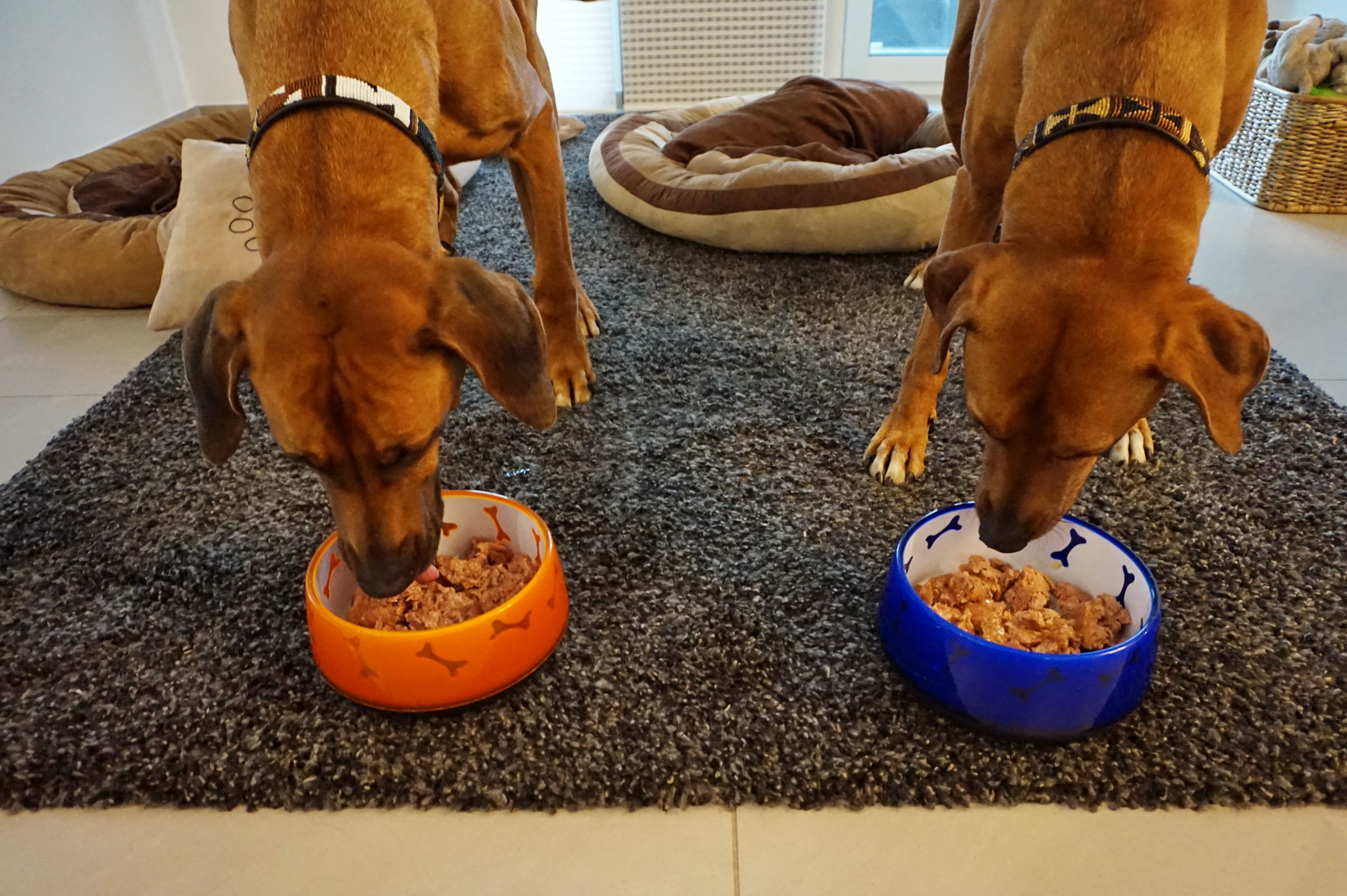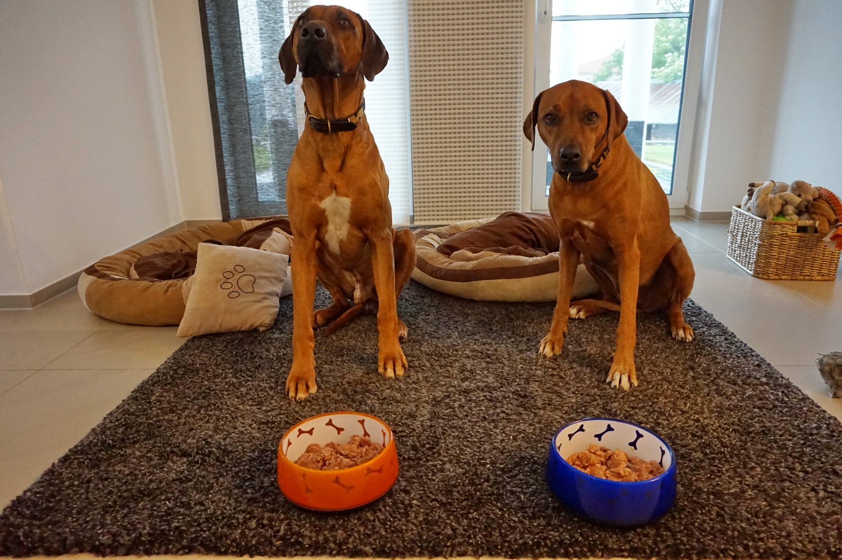 Nur dank ihrer guten Erziehung ist es möglich, Fotos zu machen. Aber es ist schon sehr schwer, denn beiden läuft im wahrsten Sinne des Wortes das Wasser im Maul zusammen … dann endlich dürfen sie sich auf ihre Futternäpfe stürzen und in Windeseile ist alles verputzt und „schranksauber“ leer geleckt.