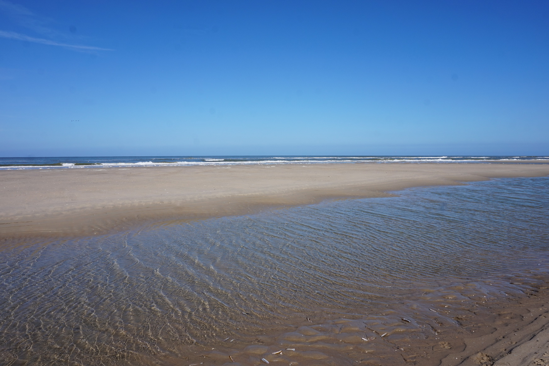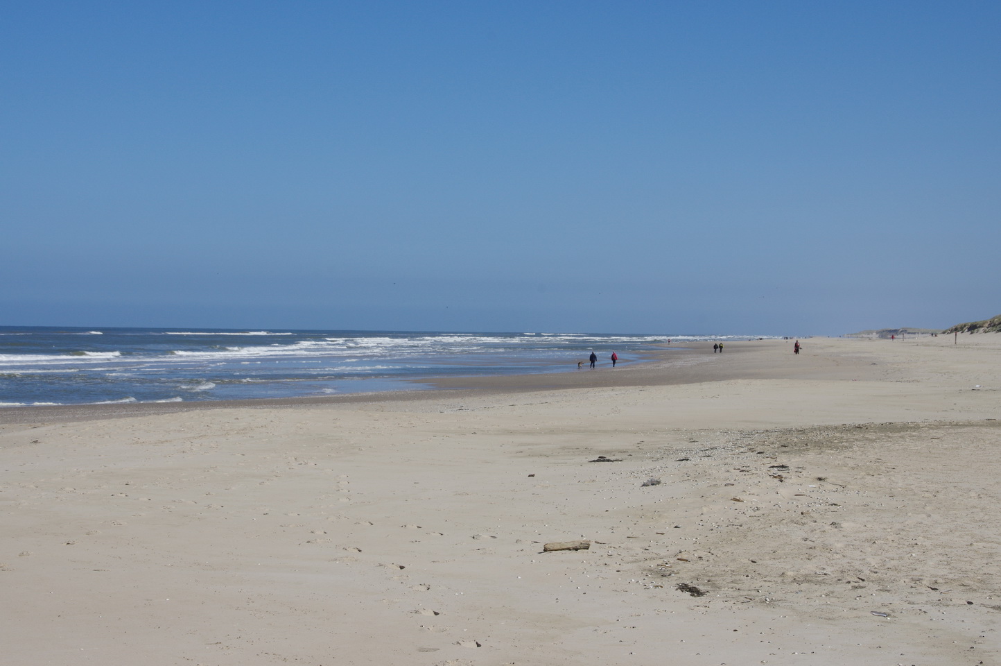 … und laufen erst einmal zum Strand hinunter. Wie an fast jedem unserer Urlaubstage auf Texel ist der Himmel strahlend blau, die Sonne lacht und eine frische Brise Wind weht uns um die Nase. Der Strand erscheint endlos und weit …