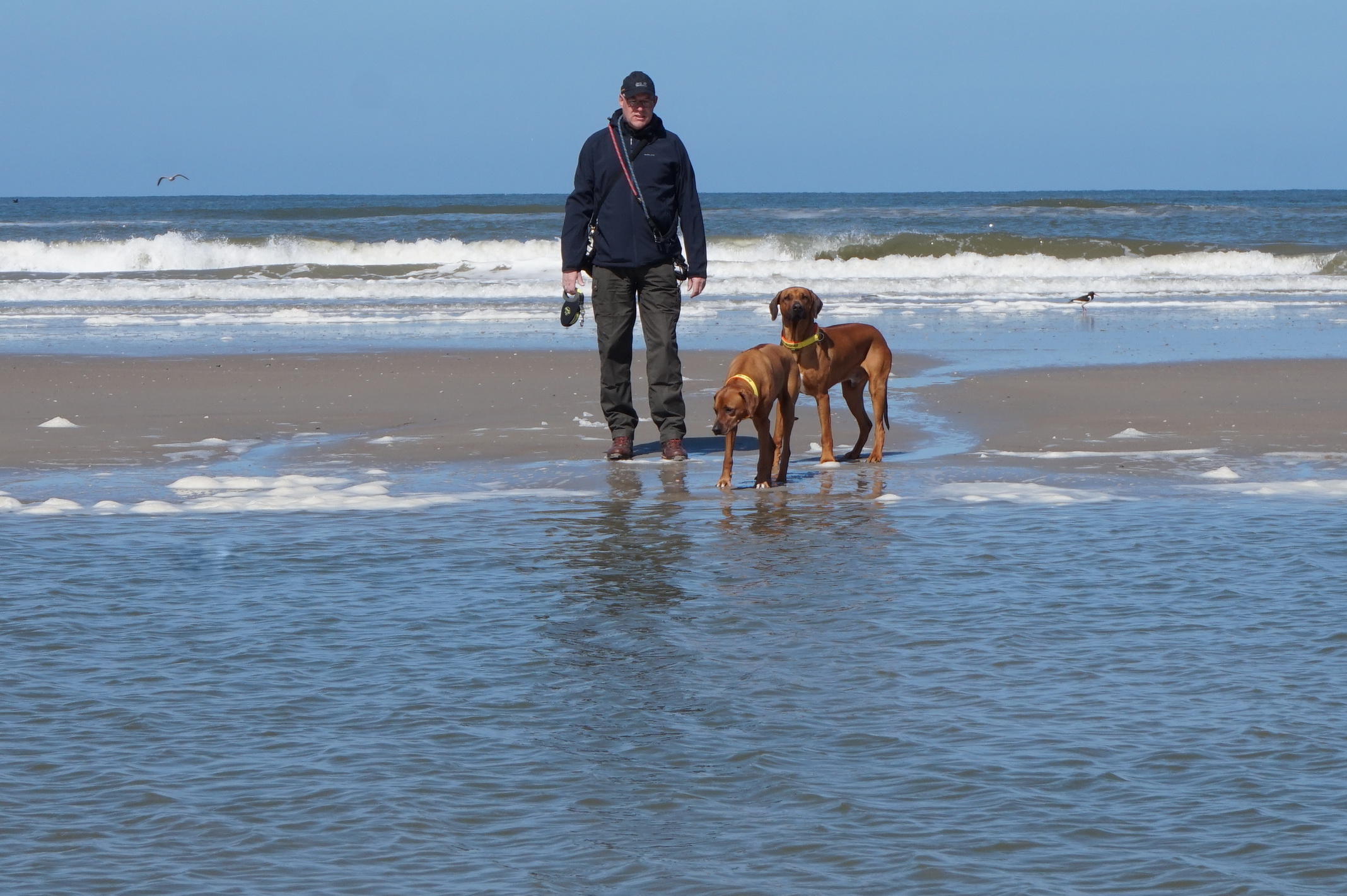 Dayo und Suri scheinen zu wissen, dass sie heute einmal mehr sehr lange auf ihren Pfoten unterwegs sind. Wie um Kräfte zu sparen, spazieren sie gemächlich am Wasser entlang. Da wird mal hier an einer Muschel geschnuppert und dort einer Möwe hinterher geschaut.