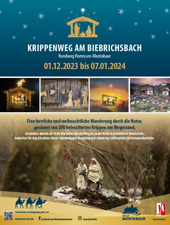 - Der Krippenweg Montabaur kann vom 29. November 2020 bis zum 10. Januar 2021 gelaufen werden. Ich habe die Strecke auf Komoot aufgezeichnet, und du kannst sie dir gerne herunterladen.