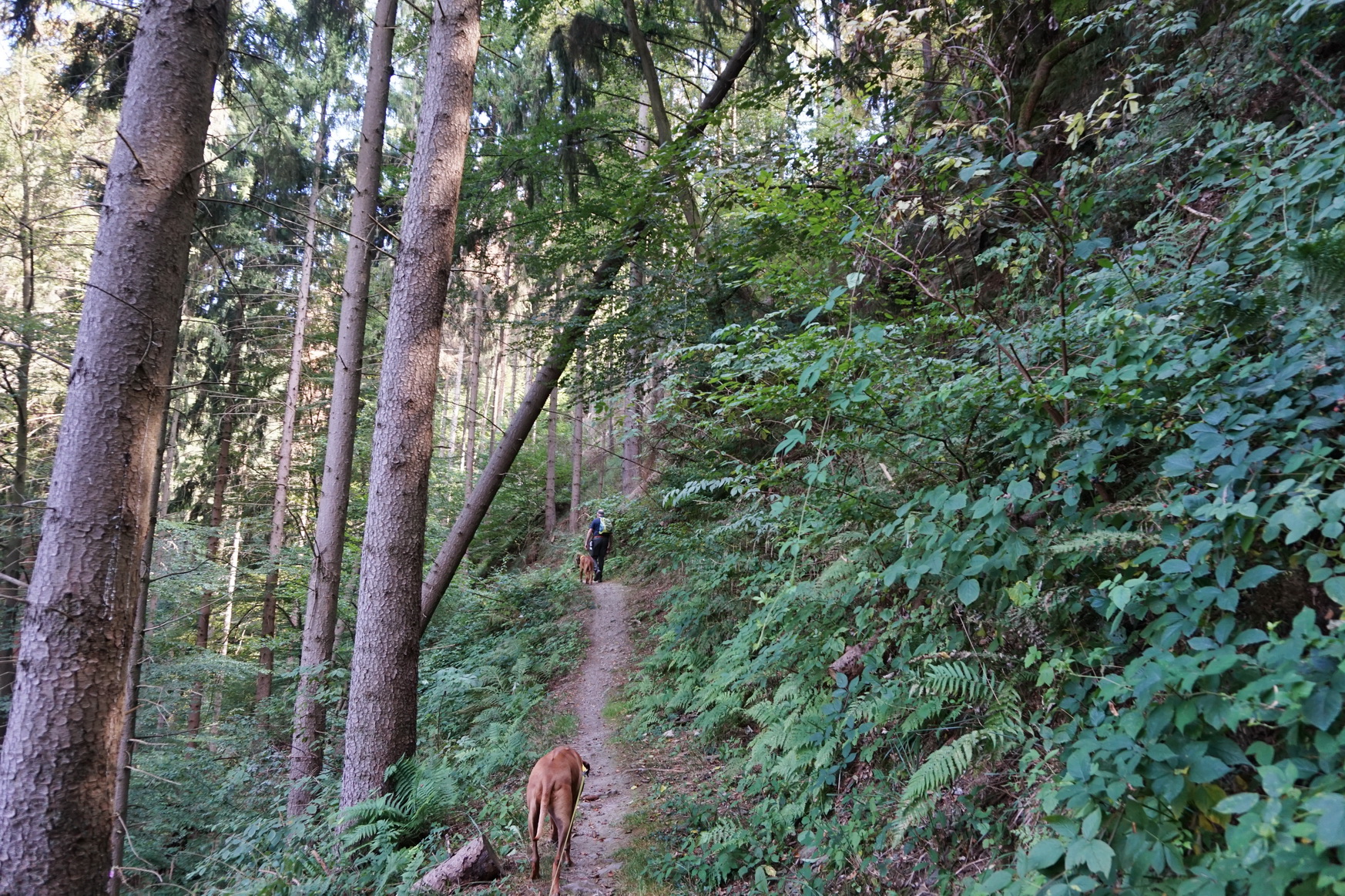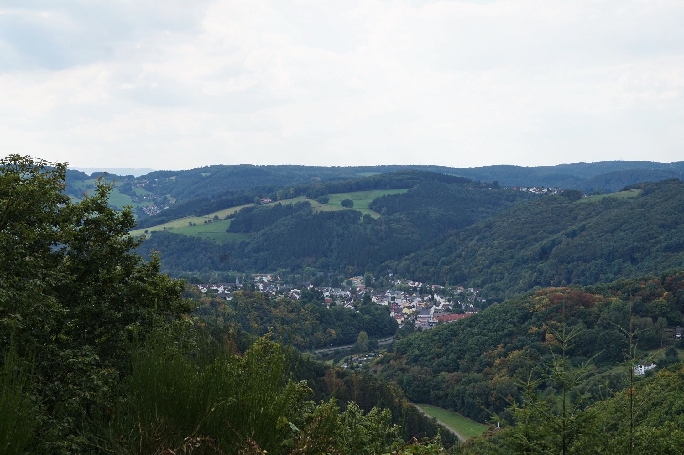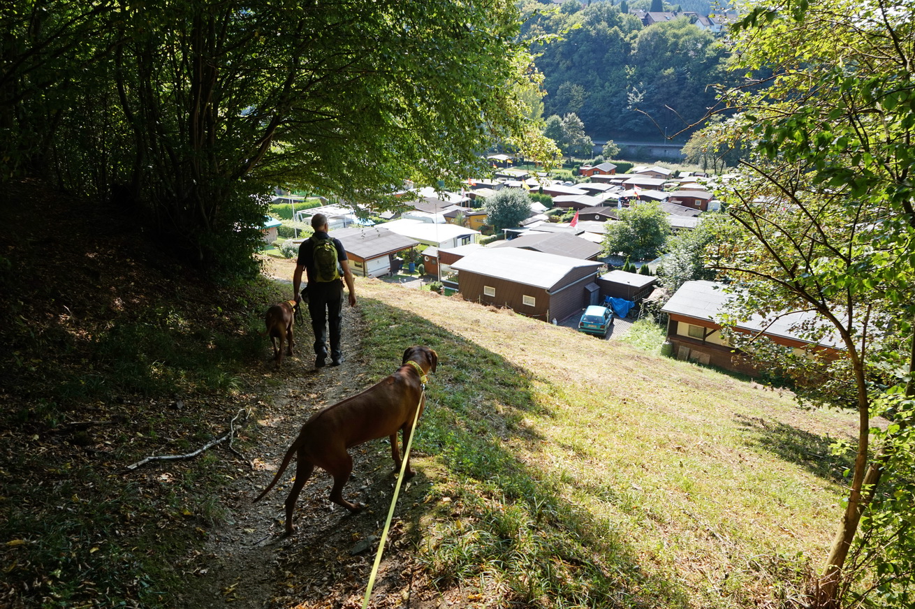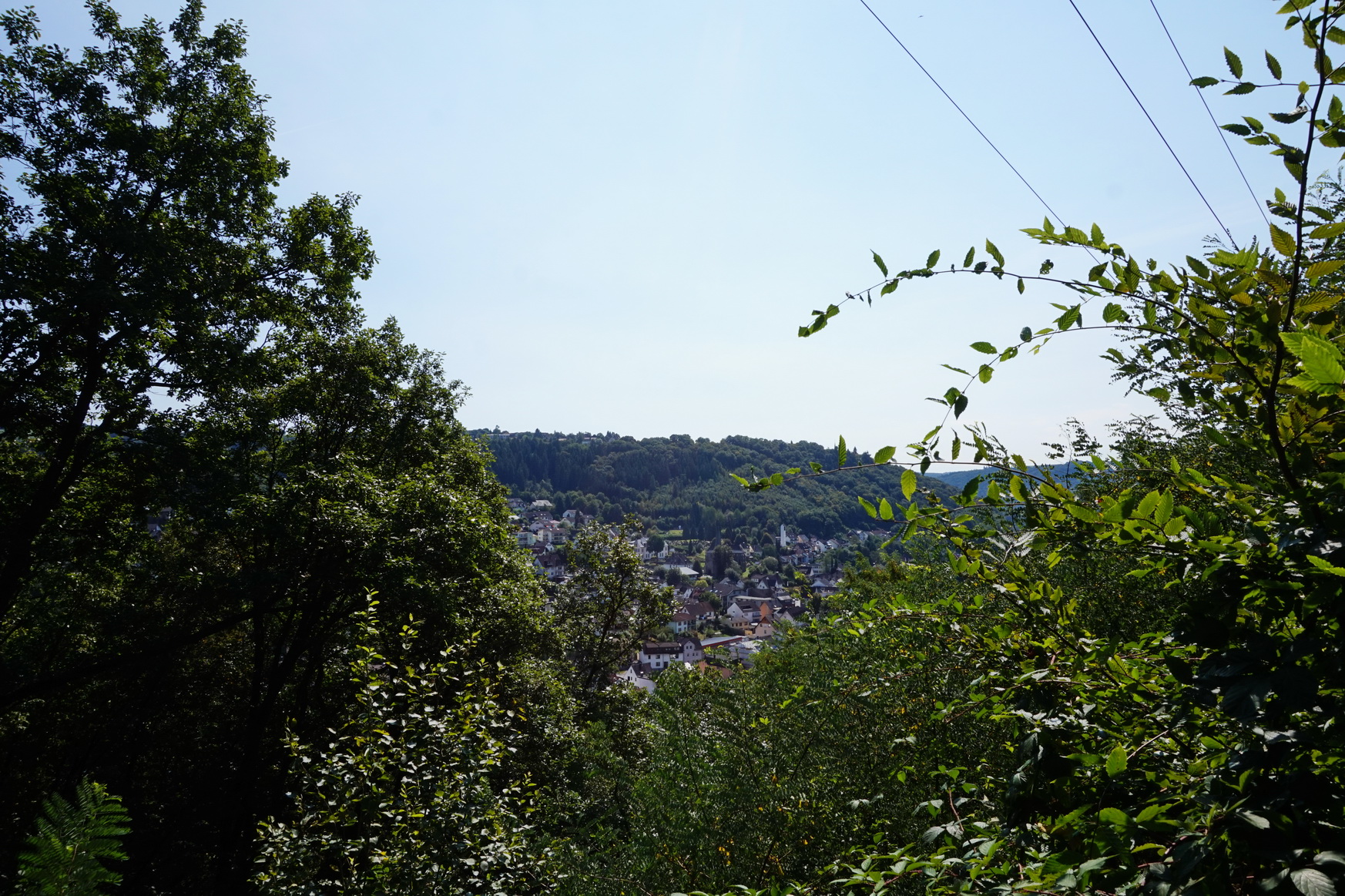 Wir spazieren bei hochsommerlichen Temperaturen durch einen spätsommerlichen Wald. Zwischendurch gelingt uns immer mal wieder ein Blick durch das dichte Grün auf Waldbreitbach.