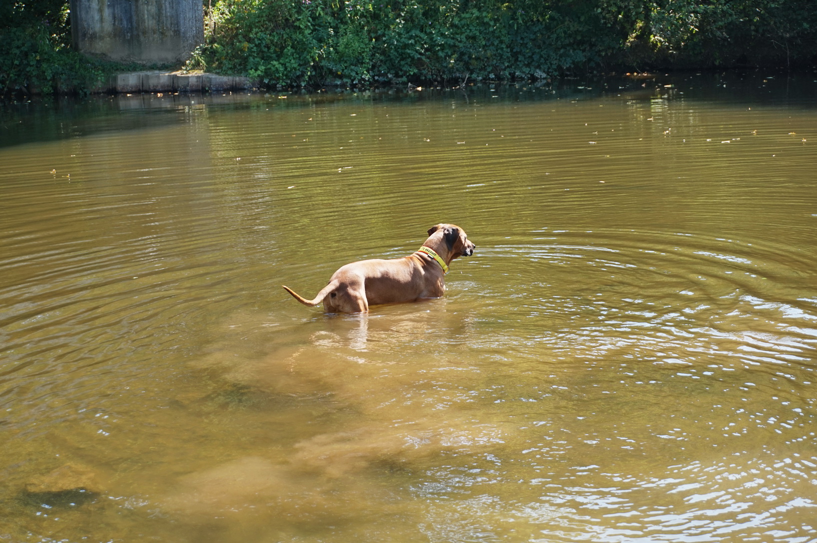… wo Dayo erst einmal ein Bad nimmt. Das ist hier (zumindest im Sommer) fast die einzige Möglichkeit für die Hunde, Wasser in der freien Natur zu trinken. Ihr solltet bei dieser Tour also unbedingt Wasser für die Vierbeiner mitnehmen.