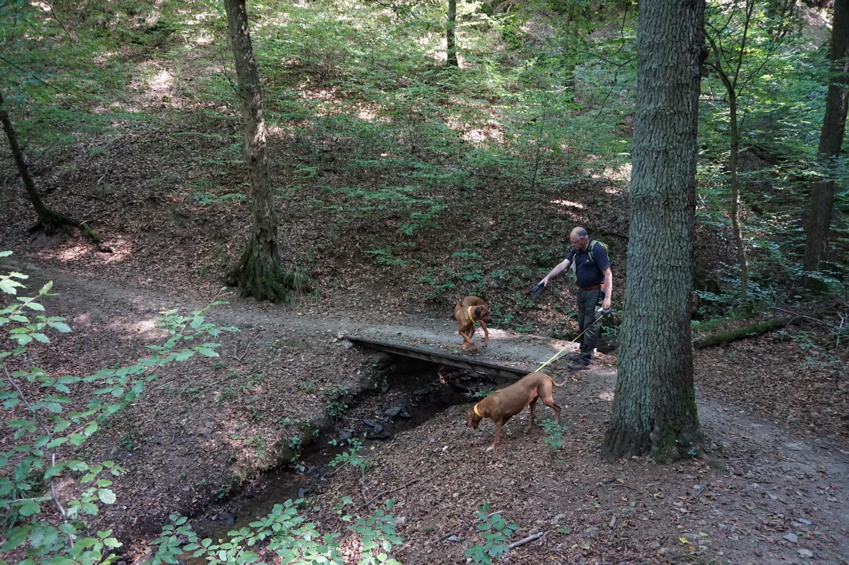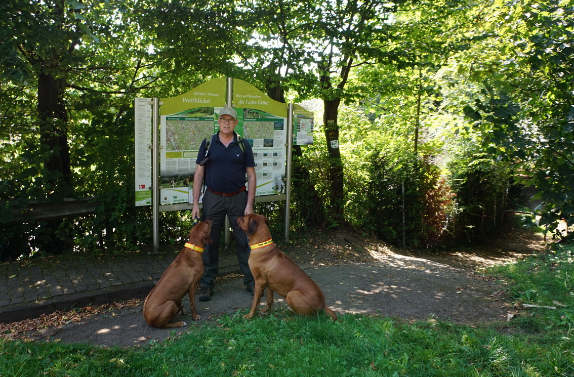 Hier darf ich jetzt auch endlich eine Pause im Sitzen machen … 😉 … nachdem Dayo und Suri mit Wasser versorgt sind, mache ich mich über mein belegtes Brötchen her, das mir selten so gut geschmeckt hat wie heute. Dann geht es auch schon wieder weiter. Immer noch bergauf. Aber der Weg ist nun nicht mehr so steil. Er führt uns an den Rand des Dorfes Verscheid. Und von dort aus geht es zurück in Richtung Waldbreitbach.