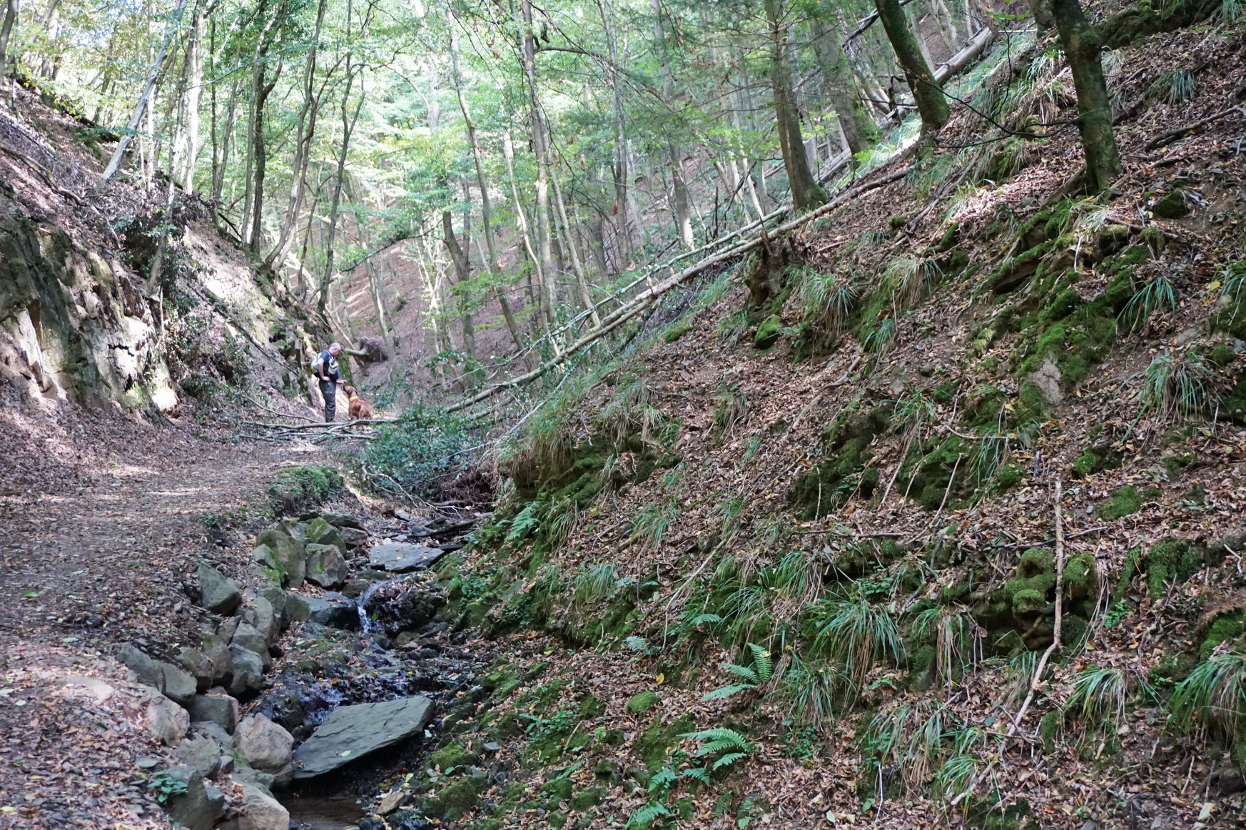 Es geht natürlich nicht immer nur bergauf. Hin wieder passiert es, dass wir auch mal fünf Meter bergab spazieren. Der Weg ist mehr ein Pfad und läuft – wie ich später auf der Karte sehen werde – in langen Serpentinen durch den Hochscheider Seifen. Hierbei handelt es sich um Basaltformationen, wobei rechts des Weges Felswände steil nach oben gehen und links den Blick in ausgewaschene Basaltbecken freigeben.