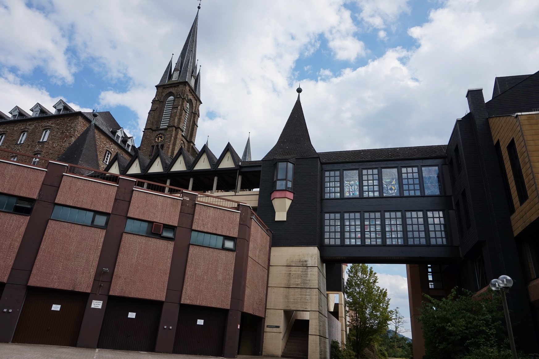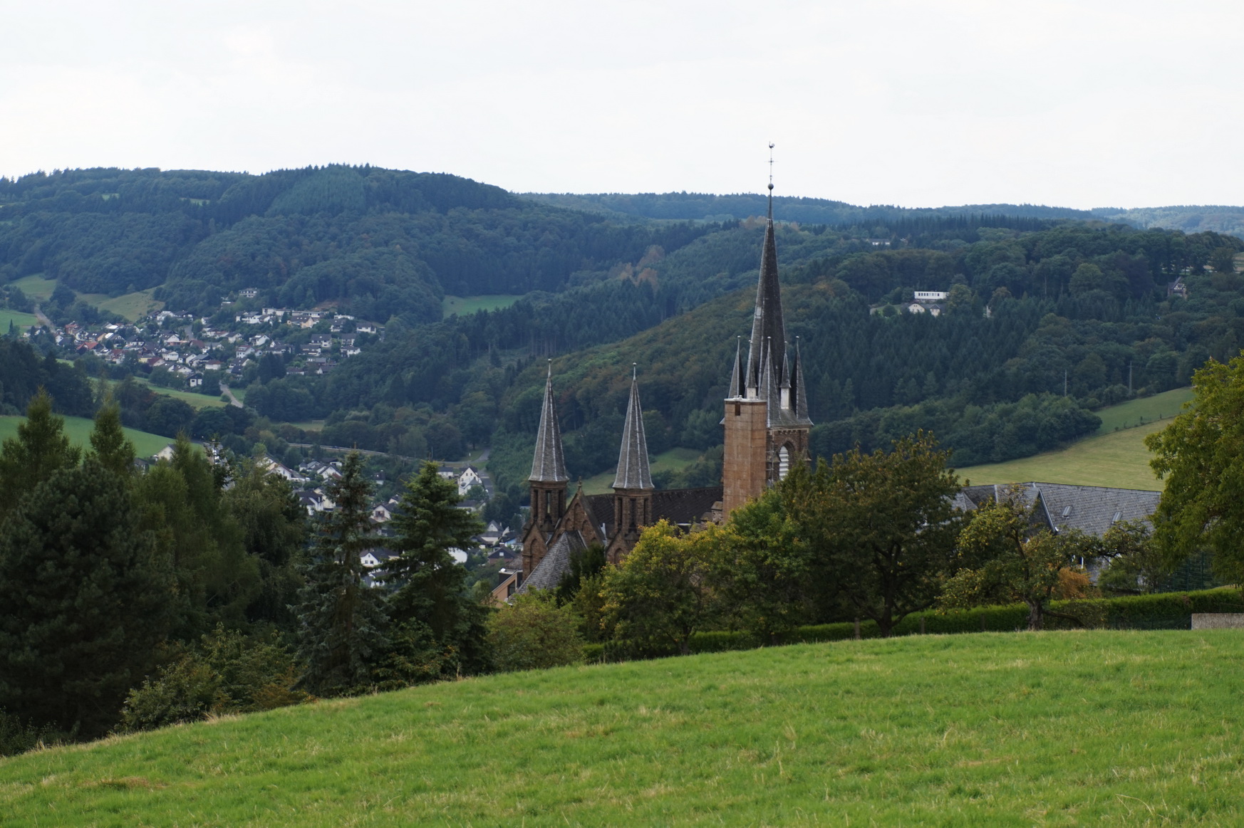 Für uns geht es weiter durch Wiesen und Felder. Und schon bald erblicken wir die Türme des Klosters der Waldbreitbacher Franziskanerinnen.