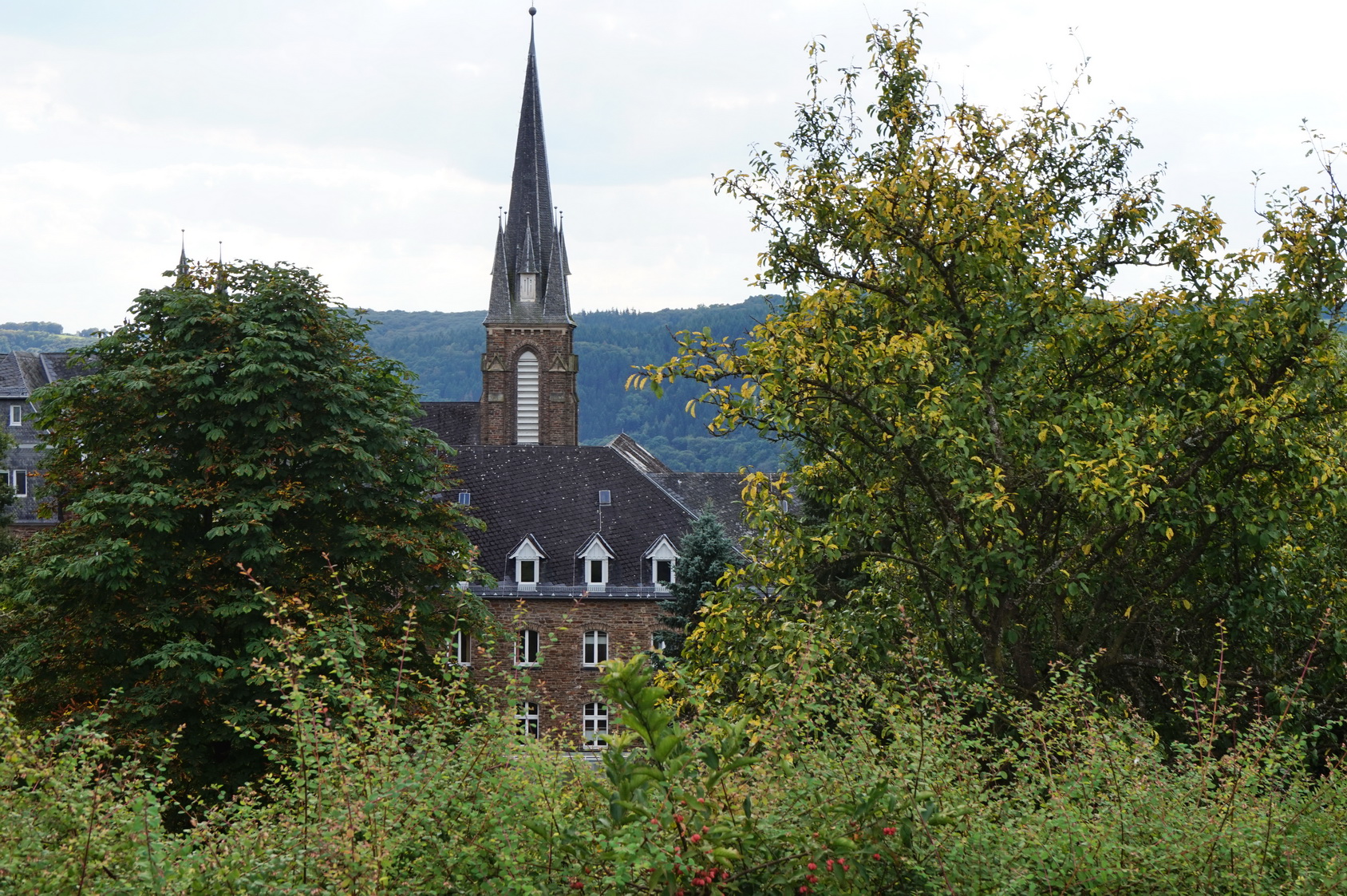 Noch ein letzter Blick auf unser Ziel, dann nehmen wir die letzten zwei Kilometer in Angriff. Und die haben es nochmals in sich. Die 446 Höhenmeter, die wir nach oben gelaufen sind, wollen ja auch schließlich wieder nach unten gelaufen werden. Da der Weg von Verscheid bis zum Kloster als eher gemächlich abfallend beschrieben werden kann, wird es jetzt nochmals richtig steil.