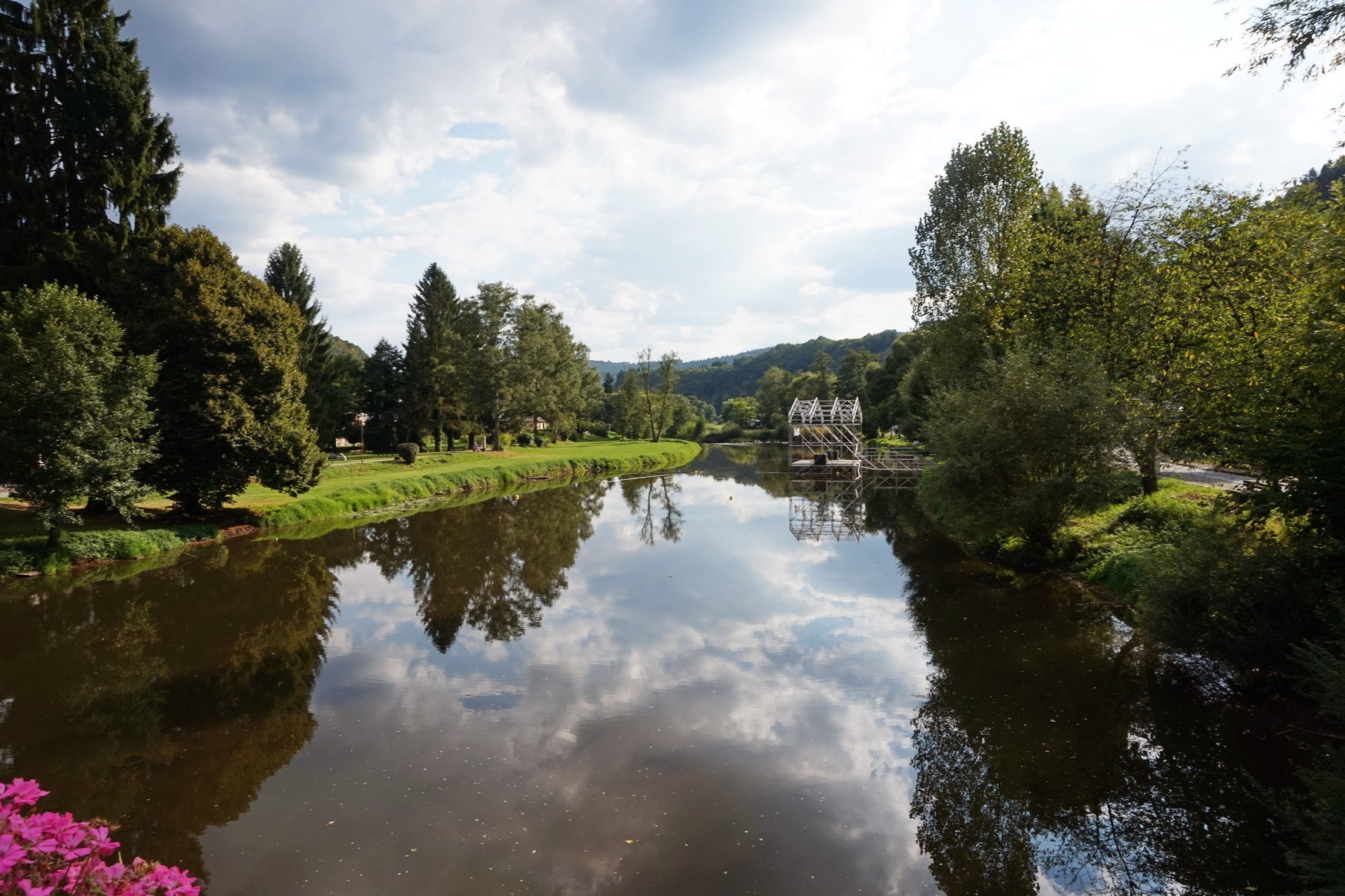 Träge fließt der Fluss dahin, den wir mittels einer Fußgängerbrücke überqueren, und liegt friedlich in der doch ziemlich warmen Mittagssonne. Für uns geht es über eine Landstraße und dann wieder stramm bergauf. Ein Hinweisschild besagt, dass wir an einem jüdischen Friedhof entlang laufen.