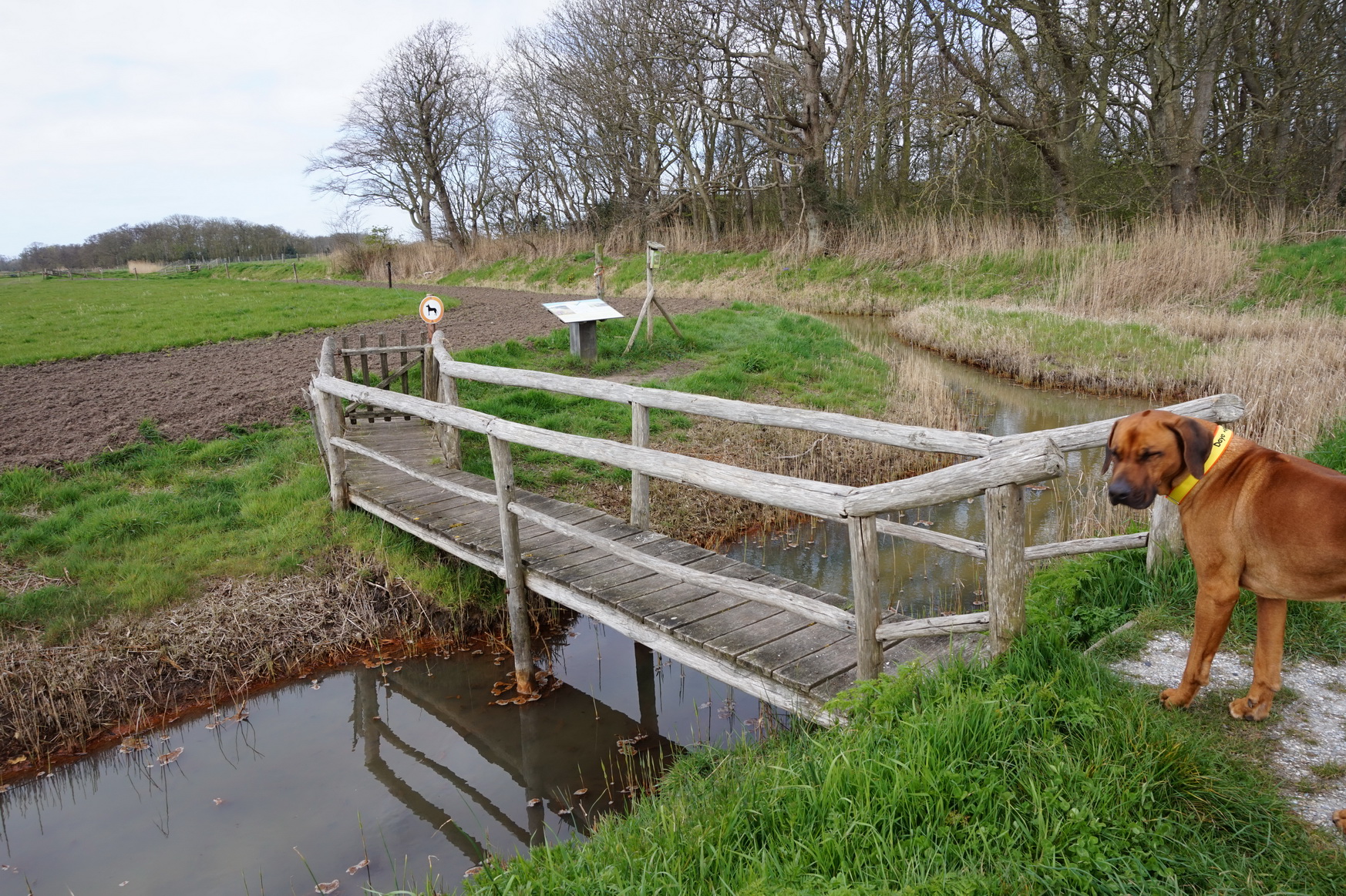 Wir spazieren hier erst einmal an einem Graben-Flüsschen entlang in Richtung Bauernhof Brakestein. Im Wasser und auf den Wiesen ist ziemlich viel los. Während die Ente auf Tauchgang ist, merkt Suri Gott sei Dank nicht, dass Meister Lampe fast direkt neben ihr ein Päuschen eingelegt hat.