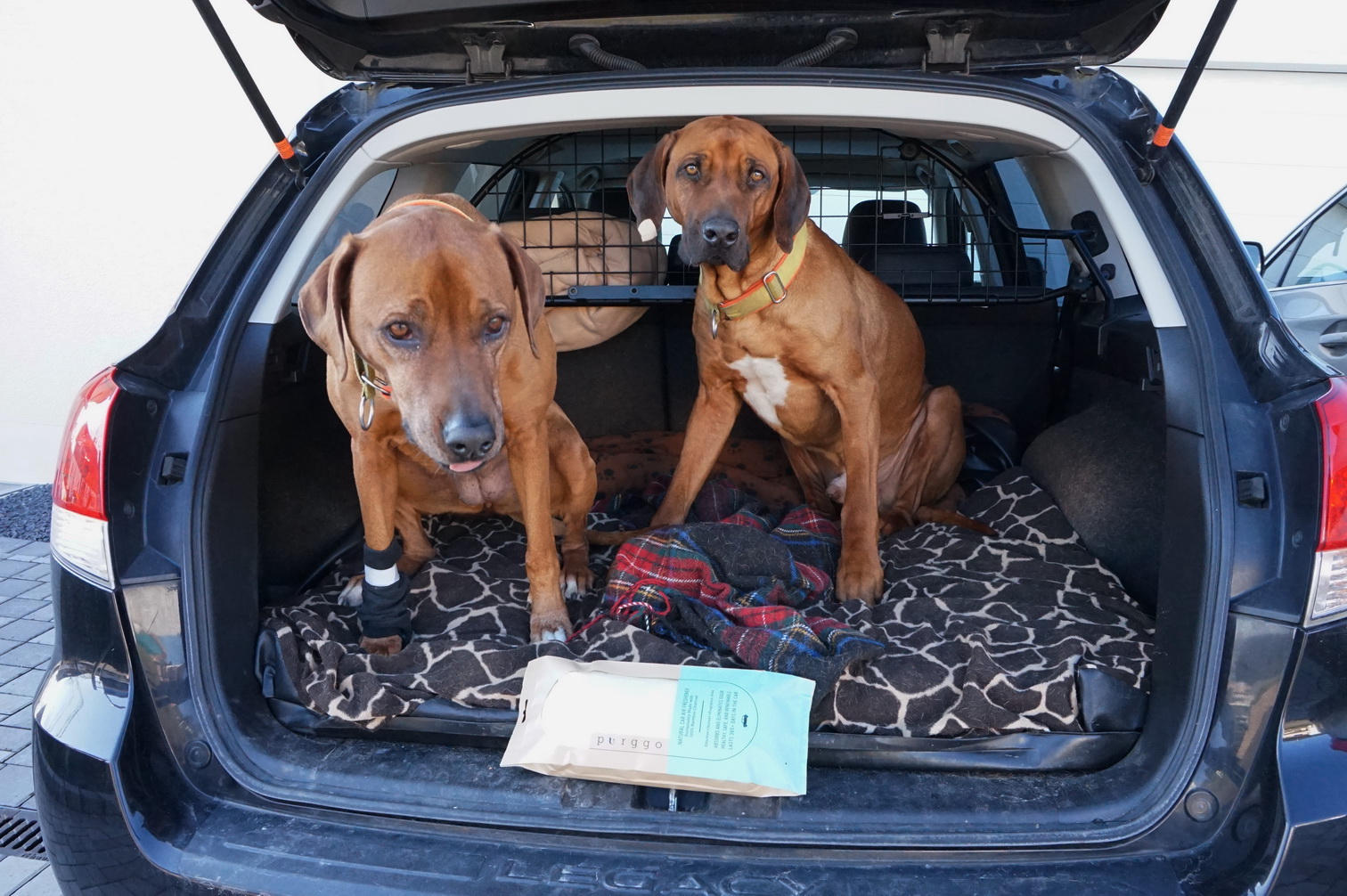 Ich hänge meinen PURGGO also an der Kopfstütze des Fahrersitzes auf. Ich bin sowieso gleich mit den Hunden im Auto unterwegs und bin schon gespannt. Und was passiert?