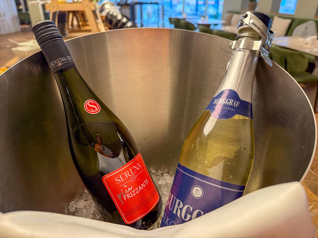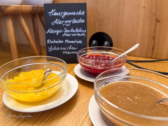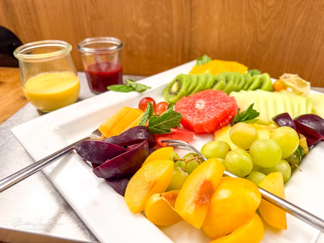 Meine persönlichen Highlights waren die selbstgemachten Marmeladen, der leckere Fleischsalat, das wirklich hervorragende Bircher Müsli und ein frischer Obstsalat, bei dem die Apfelstücke endlich mal nicht riesengroß geschnitten waren. Und wer möchte, kann sich zum Frühstück sogar ein Gläschen Sekt gönnen.