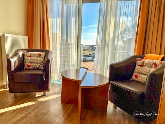 Besonders schön fand ich den Balkon, der perfekt ist, um ein wenig die frische Nordseeluft zu genießen. Im Februar war es – trotz der bereitliegenden Decke – allerdings noch etwas zu windig und zu kalt, um länger draußen zu sitzen. Im Sommer stelle ich mir diesen Platz dafür umso schöner vor: morgens mit einer Tasse Kaffee in der Hand und Blick Richtung Hafen.