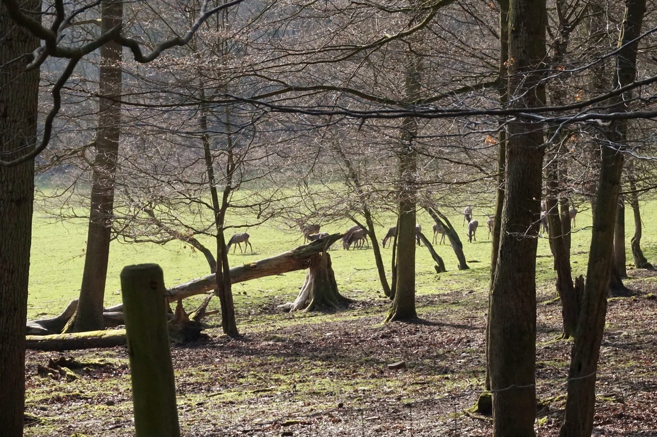 Wir begeben uns natürlich auf die „große“ Runde. Der gesamte Park ist eingezäunt und das Damwild läuft hier sozusagen frei in der Landschaft herum. Dass dem tatsächlich so ist, merken wir gleich zu Beginn, denn Suri ist extrem aufgeregt.