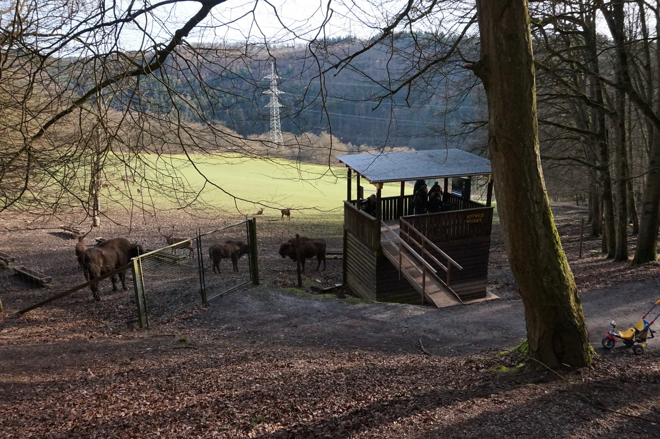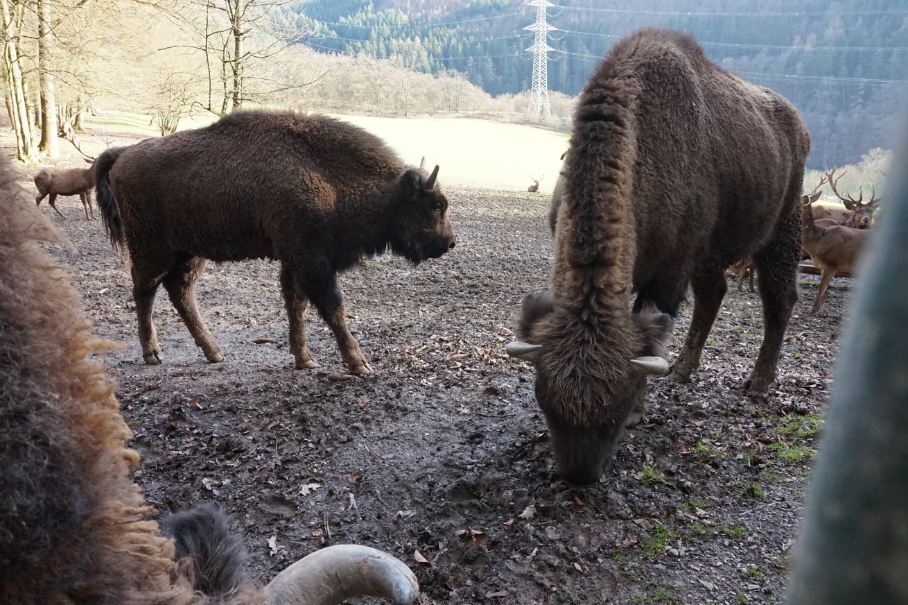 Zarin und Zarina stammen eigentlich von der Sababurg in der Nähe von Kassel und sind irgendwann in den Westerwald umgezogen (worden). Das Wisentpaar hat bereits Spuren hinterlassen. Ich nehme einmal an, dass das kleine dritte Wisent das Kälbchen von den beiden ist.