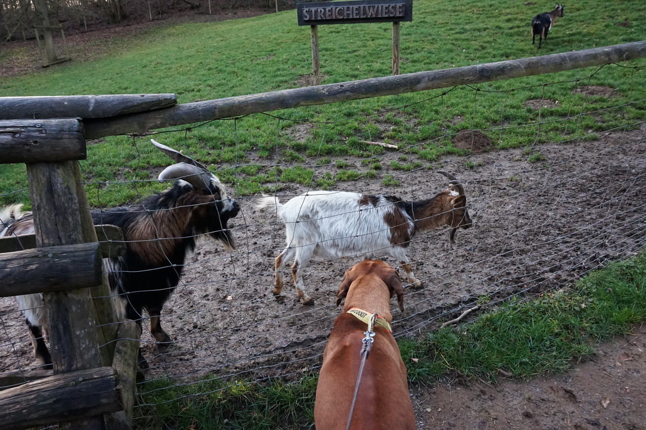 Suri interessiert sich für die leere Schweinewiese gar nicht, sondern steuert zielstrebig auf den Streichelzoo zu. Zu ihrem Leidwesen wird sie sowohl vom Zaun als auch von ihrem Herrchen gestoppt und kann nicht verstehen, warum die Ziegen nicht vor ihr weglaufen.