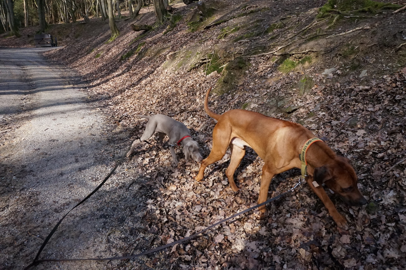 Während Dayo gemütlich durch die Gegend schnuppert, sind Suris Nase und Augen auf vollen Empfang gestellt. Uns siehe da, es dauert nur wenige Minuten, dann rennt auch schon ein Rudel Rehe nur wenige Meter von uns entfernt über den Weg und verschwindet schnell wieder im Unterholz.